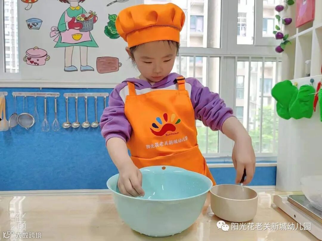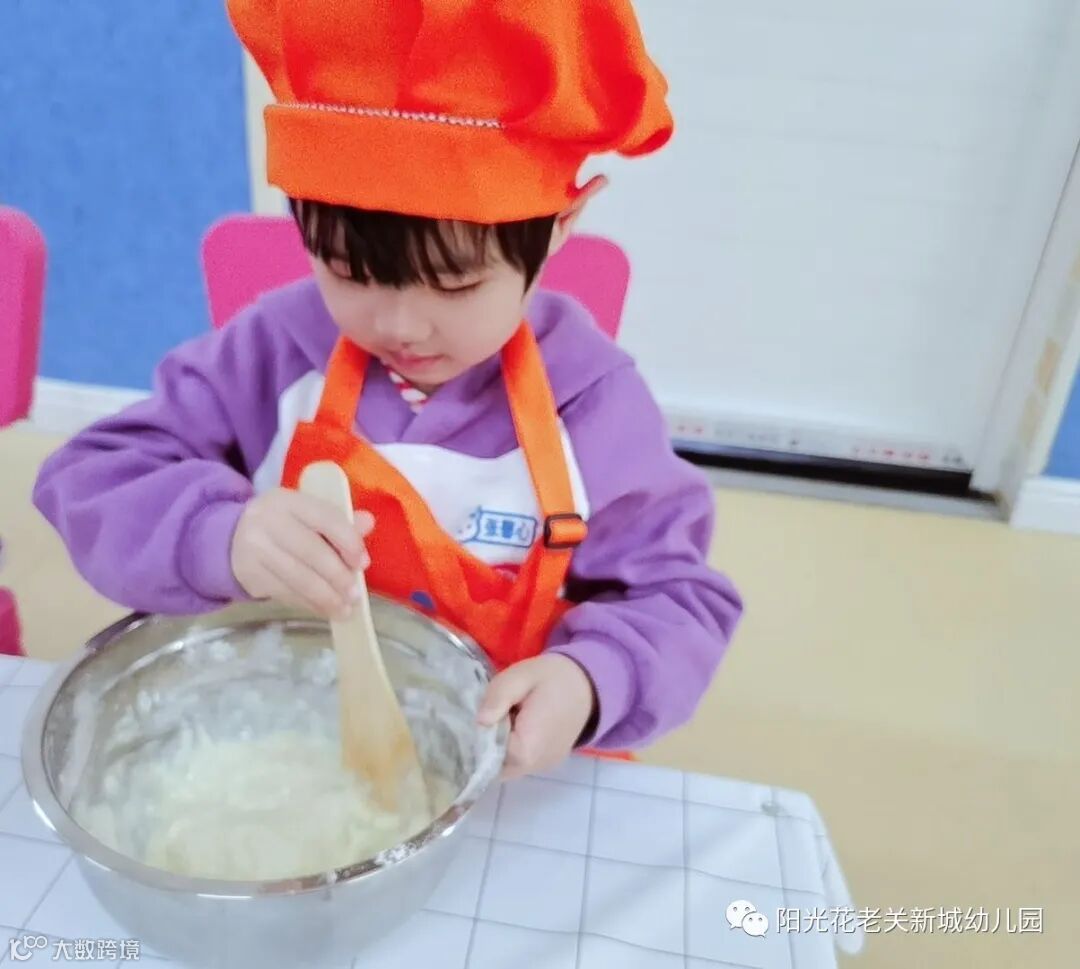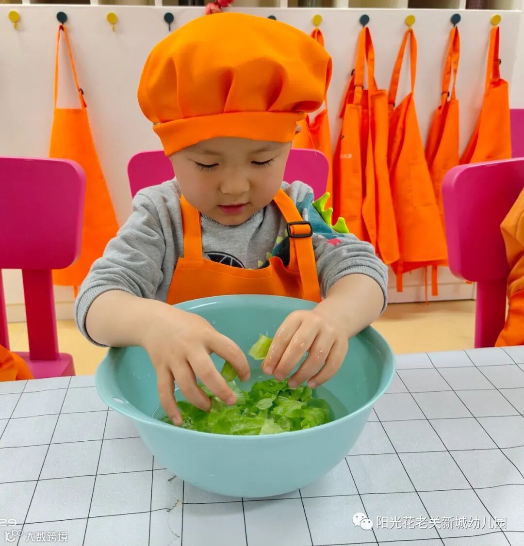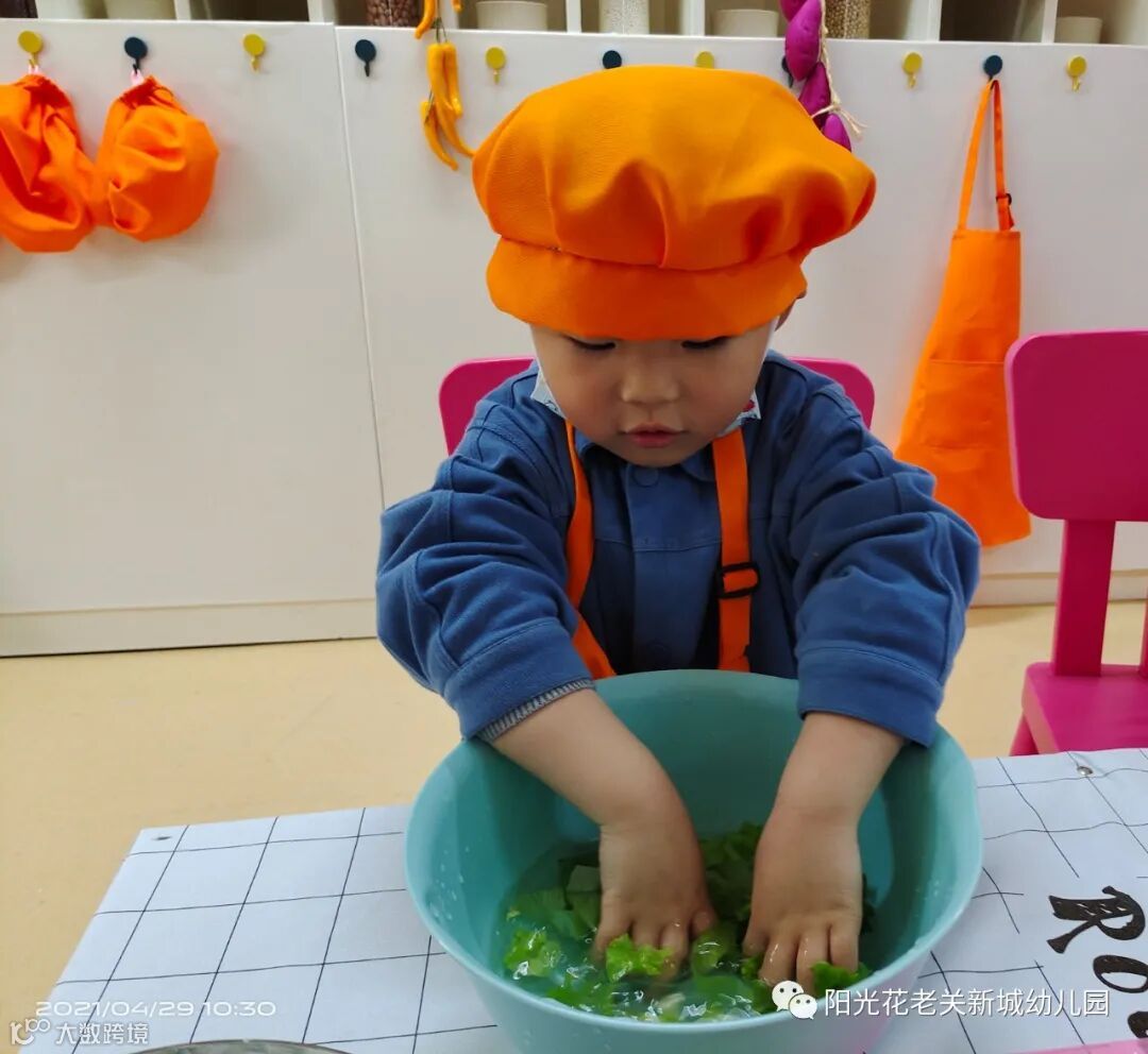 在老师的帮助和引导下,宝贝们耐心、认真、快乐地清洗蔬菜,搅拌面糊,学习制作卷饼。宝贝们争当小厨师,动手又动脑。