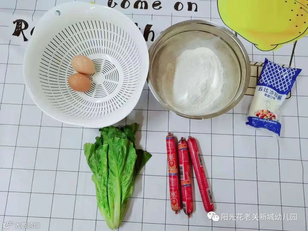 今天,我们用到的食材有鸡蛋、面粉、生菜、火腿、沙拉酱。