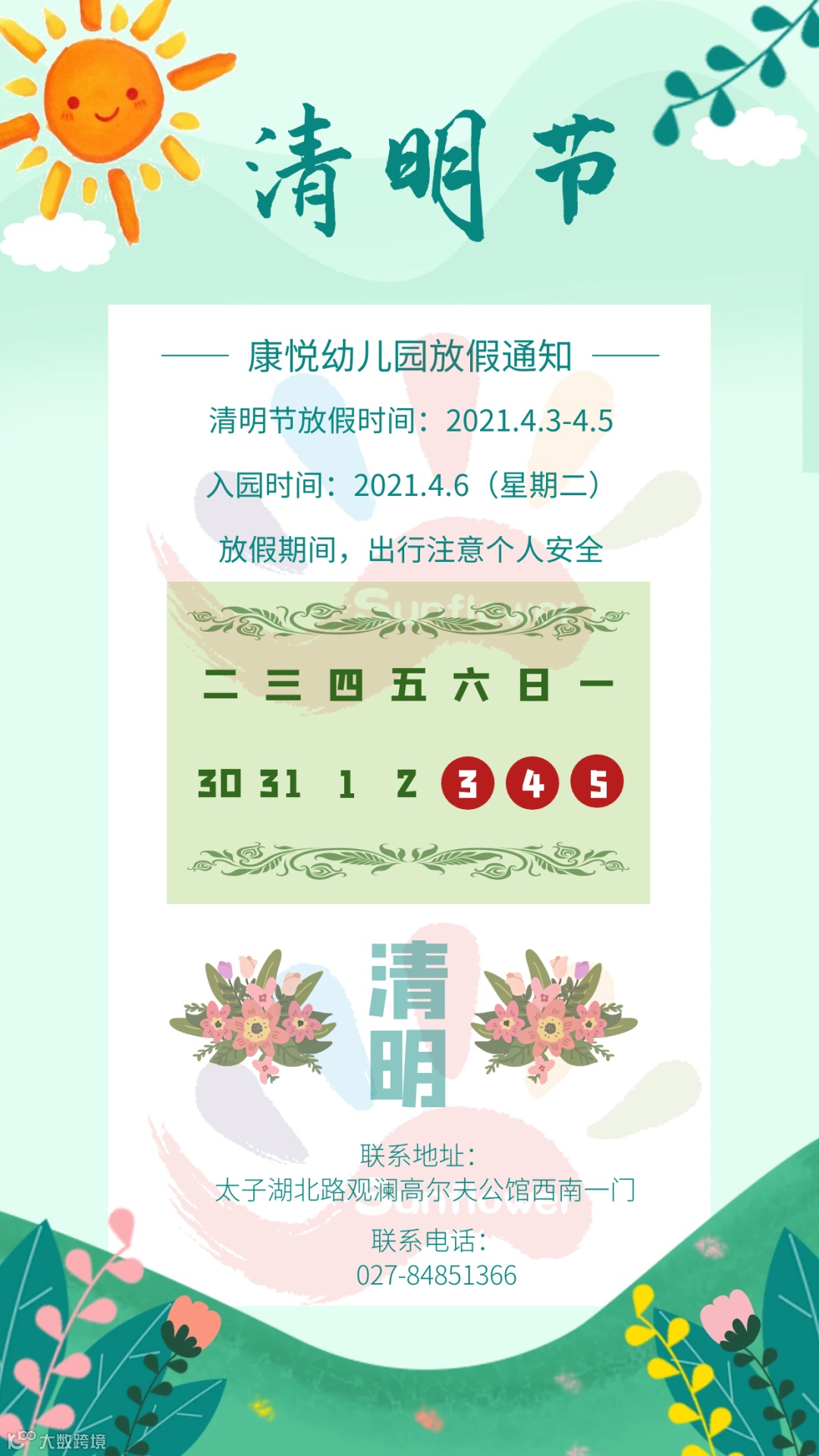 4月2日,阳光花康悦幼儿园开展了“气清景明,万物皆先”的主题教育活动,感受传统文化的博大精深,了解传统风俗,感受春景的美好,切身感受传统节日的深刻意义,懂得幸福生活来之不易,萌发感恩之情。让我们一起去看看吧!