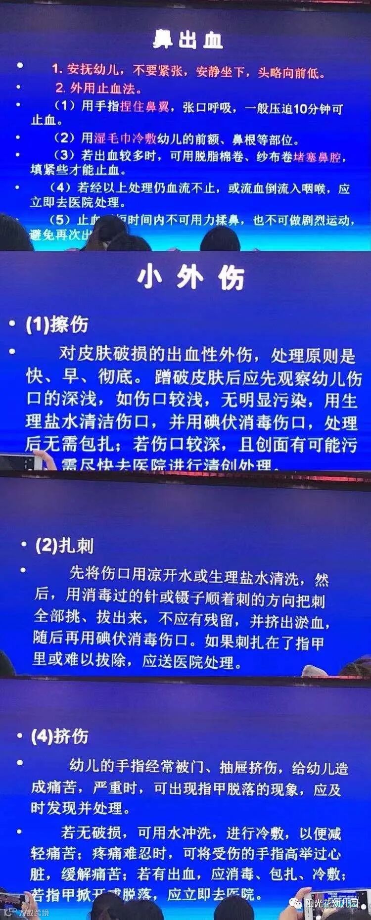 最后,园长讲解了常见的意外伤害的类型及处理方法,保育老师们都很认真的去倾听并做好笔记。