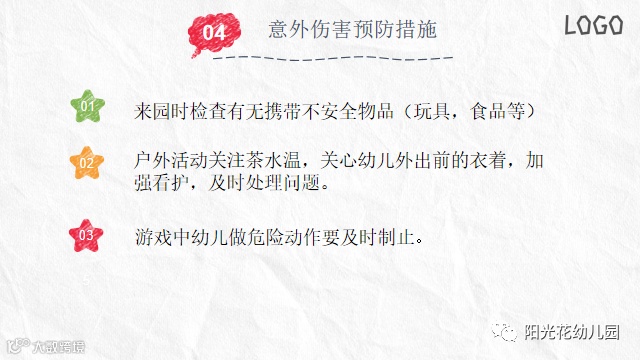 随后,园长提问问题,在一日生活中,保育员要注意哪些安全?大家积极展开讨论,提出了在室内外活动需要注意的安全;餐点中的安全;午睡安全;盥洗安全;环境清洁工作安全。
