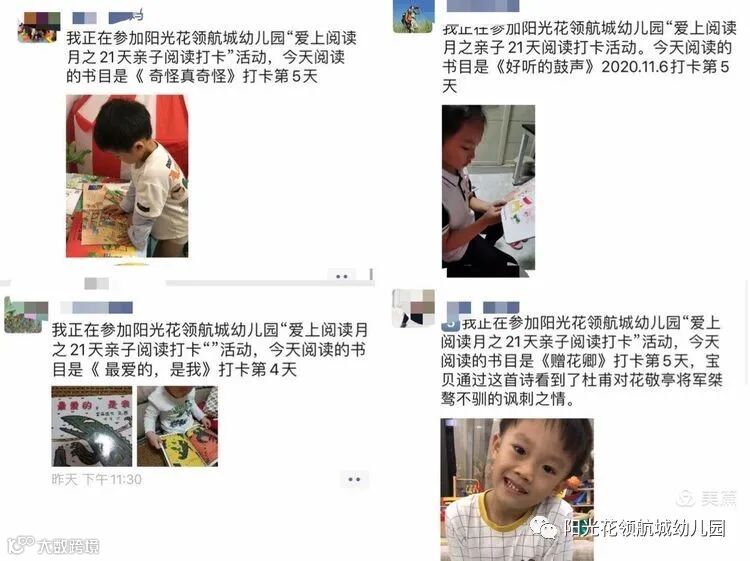 活动期间,家长们通过在朋友圈中上传亲子阅读的图片、视频以及文字,以此来记录下每天和孩子一起读书的历程。