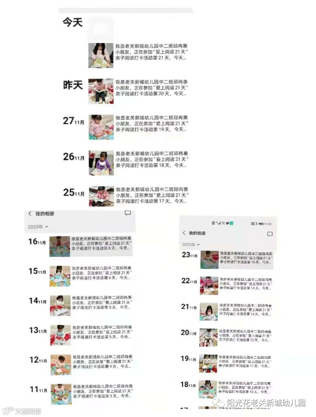 家长们每天坚持陪伴孩子阅读绘本故事,通过微信朋友圈打卡,积极分享孩子阅读的照片、视频等方式,用心的记录宝贝们成长点滴。