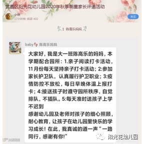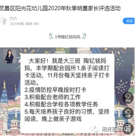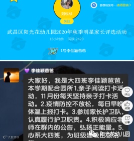 武昌区阳光花幼儿园以班级为单位,在班级家长中开展“星级家长”的评选活动,积极鼓励和调动全园家长的参与,通过线上形式邀请家长参与到活动中。