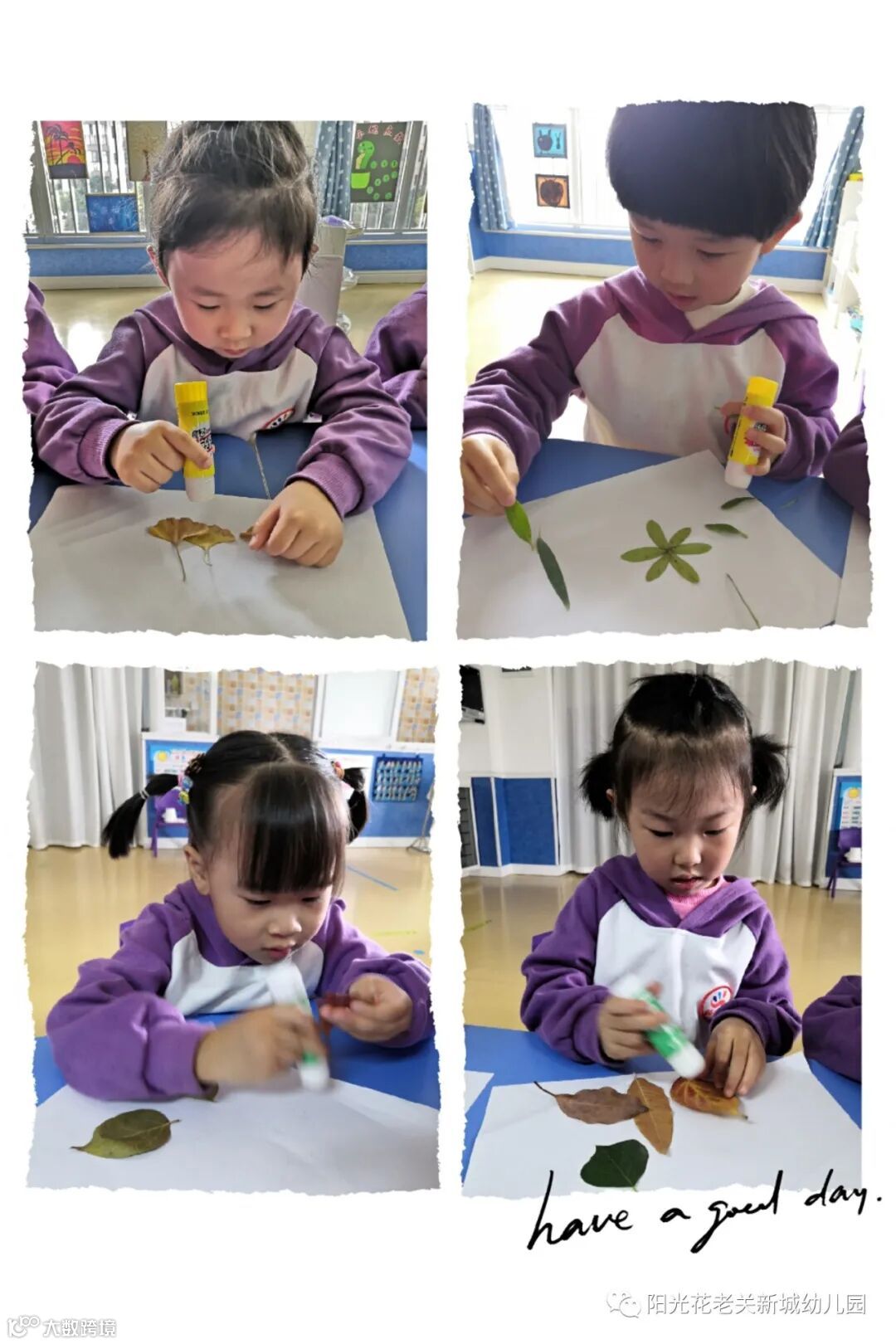 在这个金黄色的秋天,老关新城幼儿园的小朋友们,在老师的指导下完成了自己的一幅心仪的“树叶粘贴画”。
