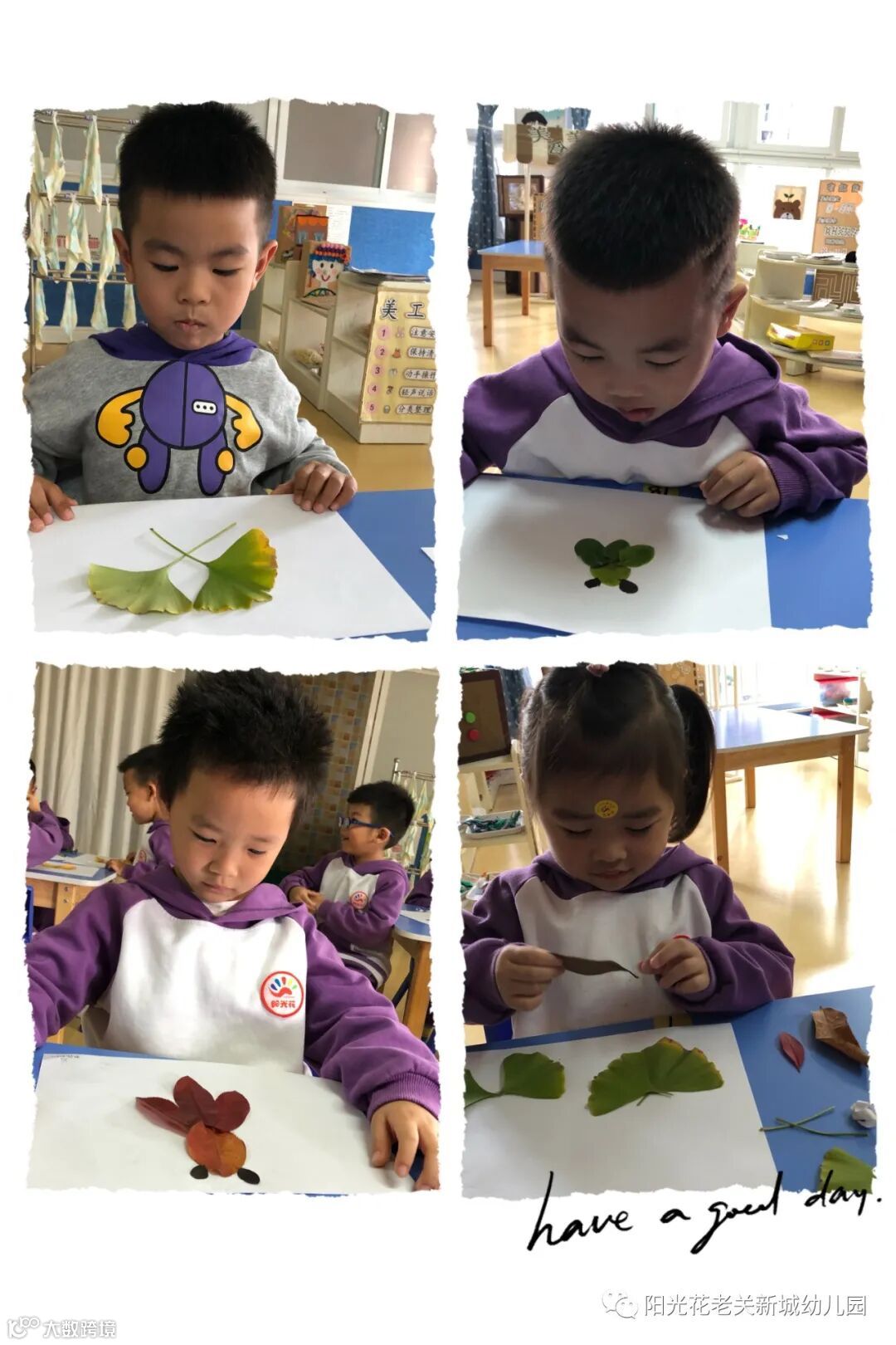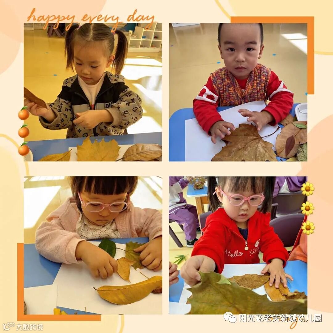 我们的生活中处处都有美,一片树叶于我们而言,可能什么也干不了,但在孩子的眼里,很可能是一件艺术品,小朋友们小心翼翼的将采集到的树叶,按照自己的想法,一片一片摆在画纸上。