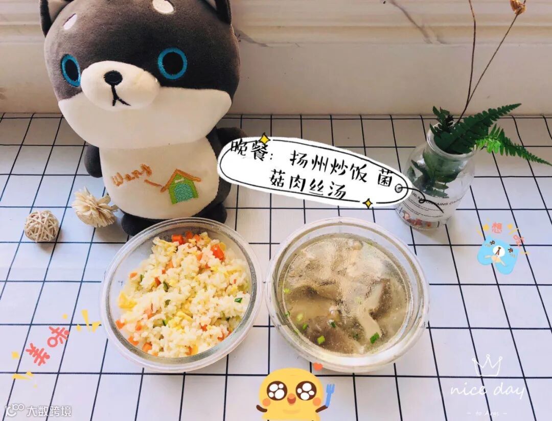 晚餐:扬州炒饭、菌菇肉丝汤