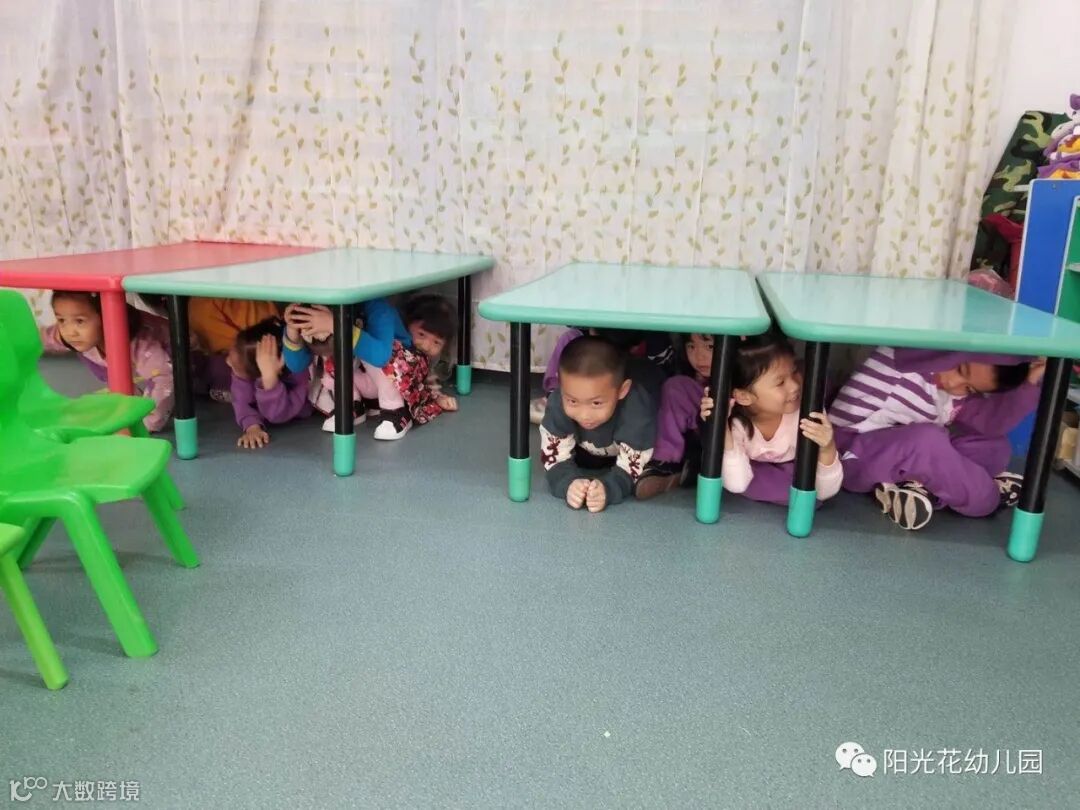“地震啦,宝贝们,请尽快就近躲避!”老师的话音未落,只见各个班级的孩子们立刻抱住头,就近躲到餐桌下、墙角边。