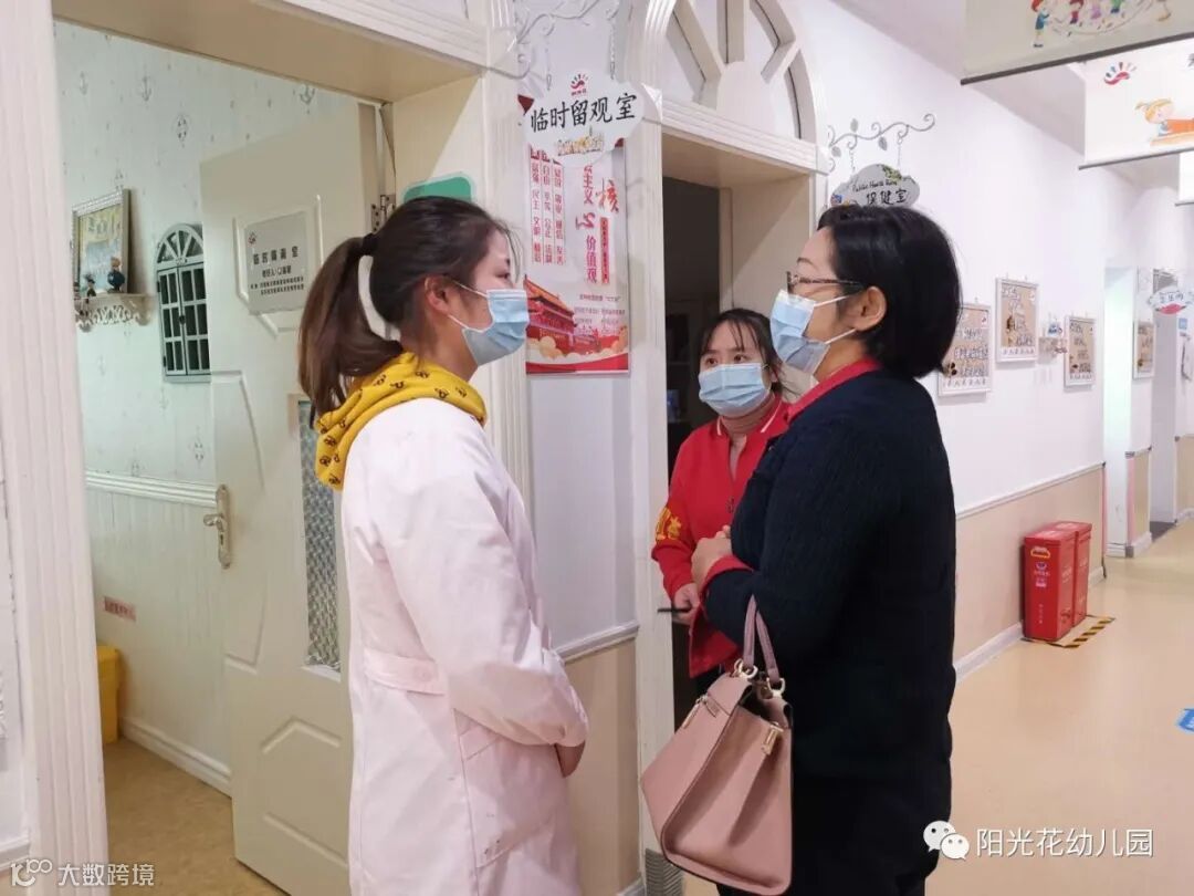 章督学做好入园前的消毒工作后进入园内查看临时留观室,并向园内保健医了解开学以来园内针对疫情情况进行了哪些举措,在看了保健医出示的班级晨午检表格后,对幼儿园全面又细致的消毒护理工作提出了高度的赞扬。