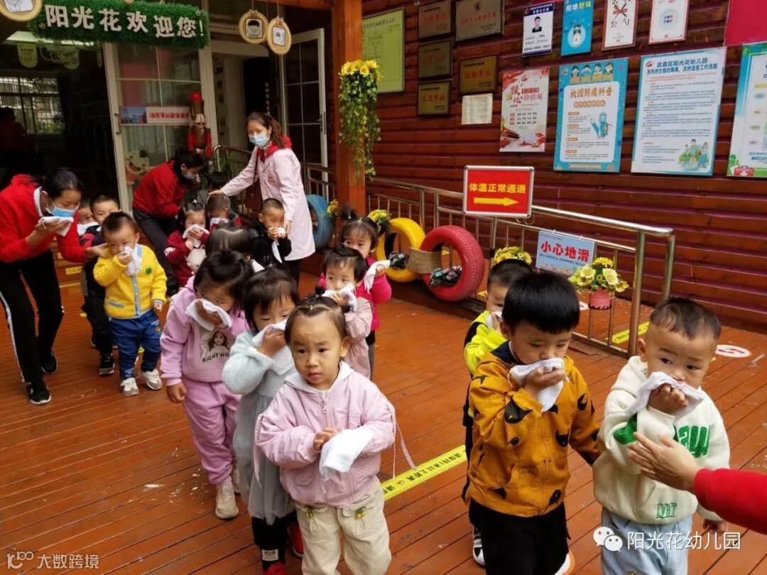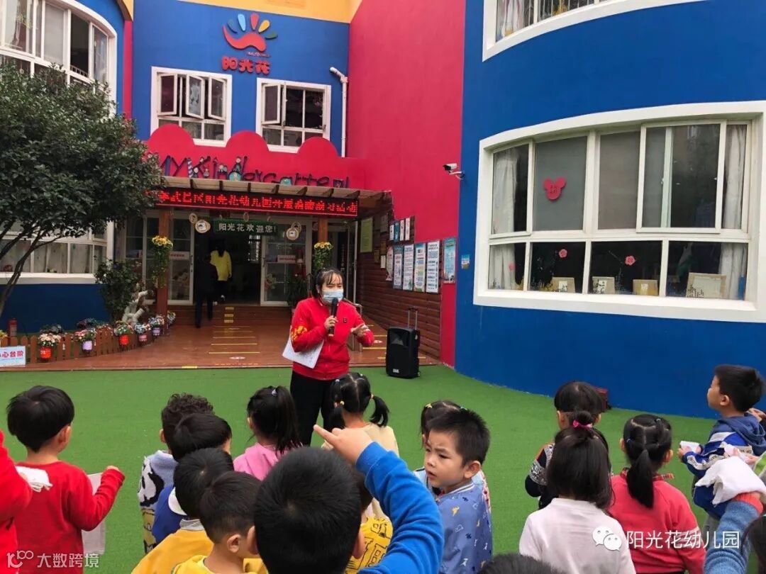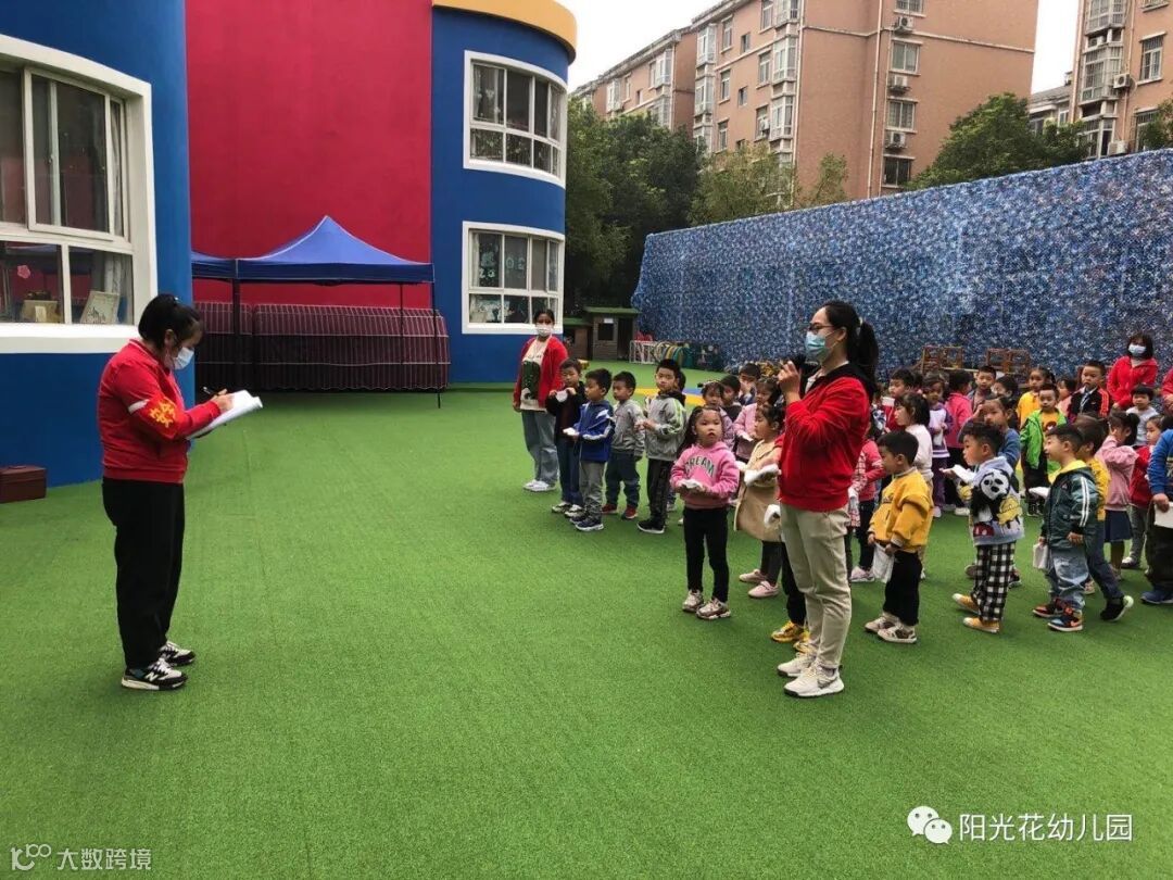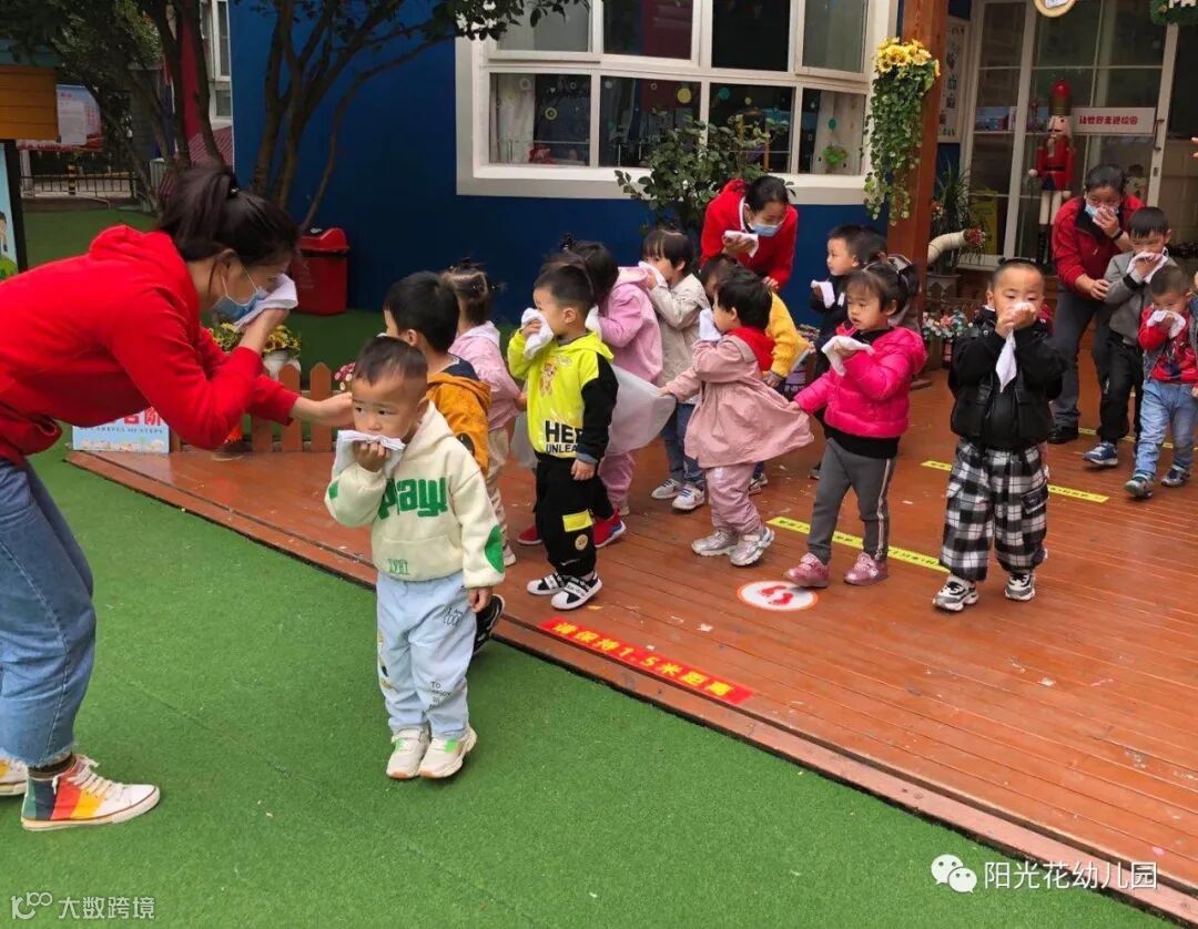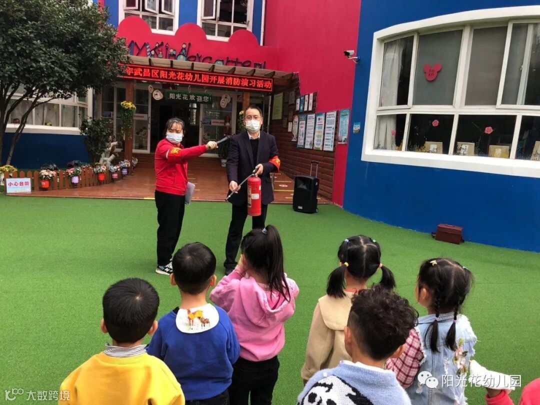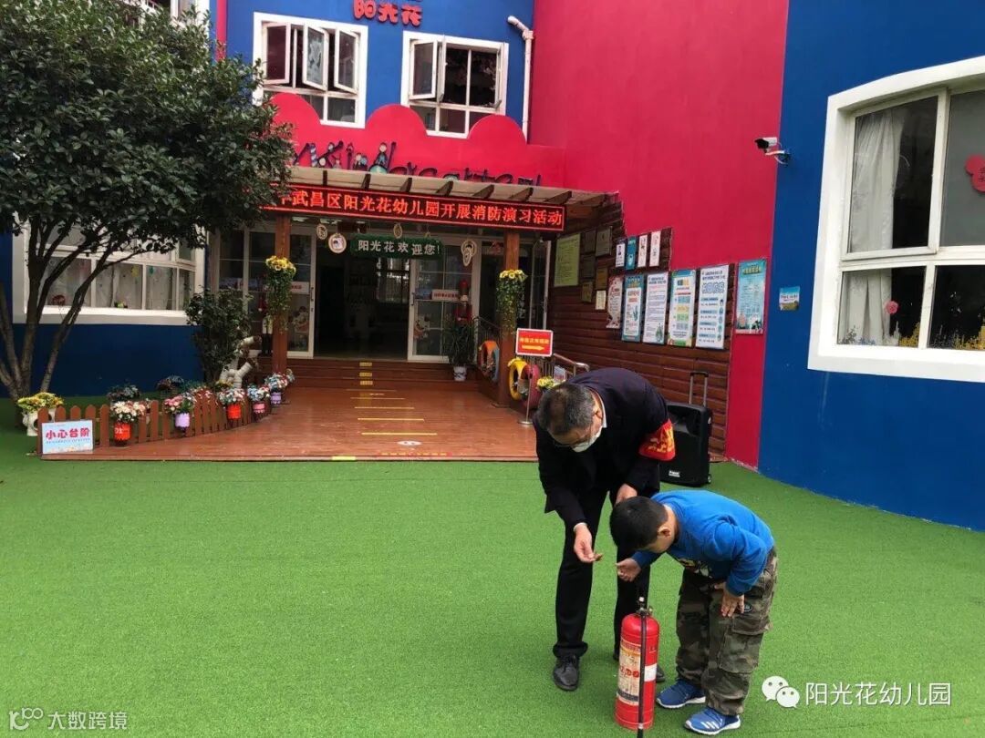 上午9:30,演练正式开始。随着一声声消防警报声响起,各班教师快速、有序地按照安全疏散路线带领幼儿用湿毛巾捂住口鼻、弯下身体,冷静、快步地走向安全出口,疏散到操场。