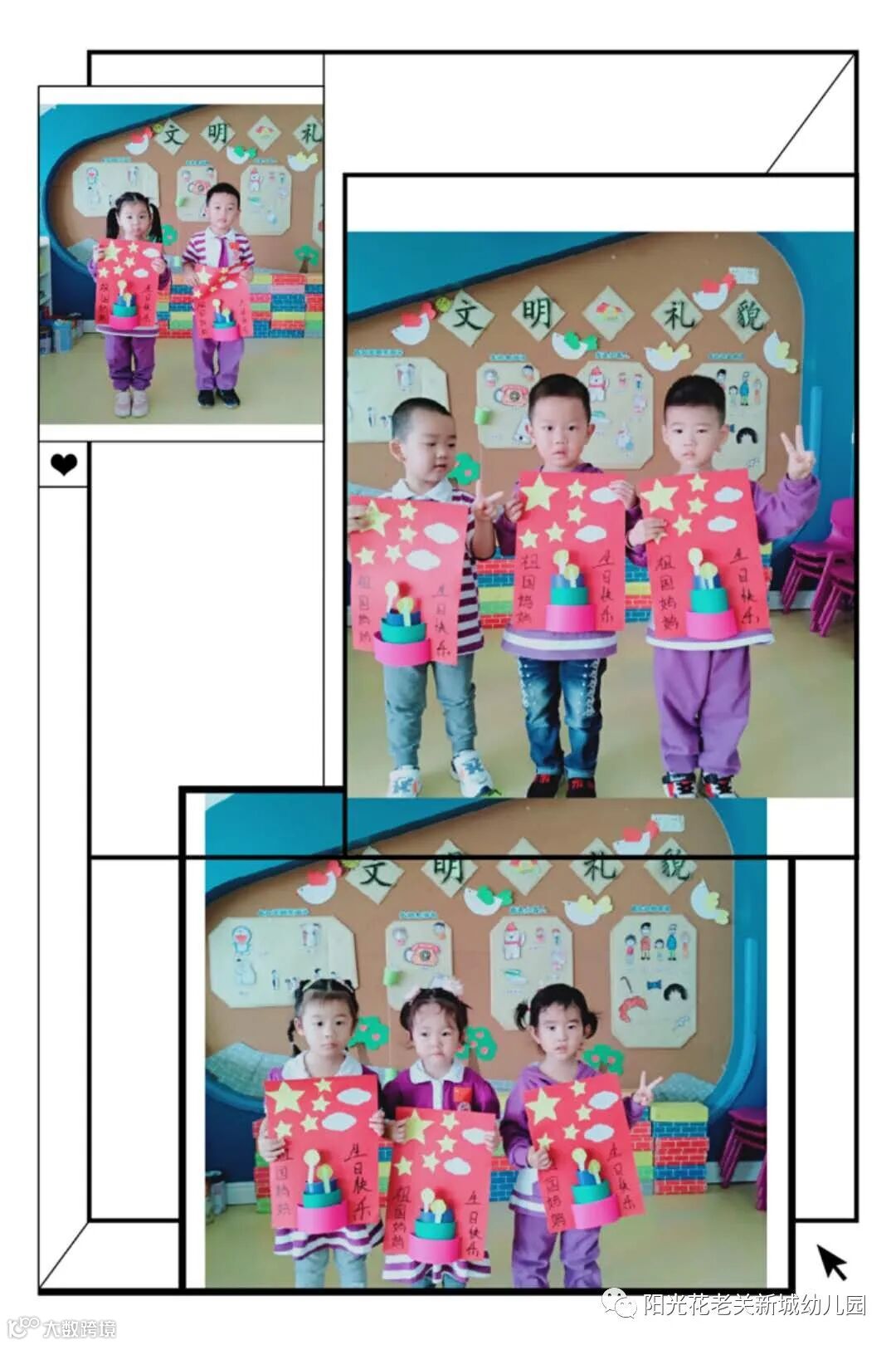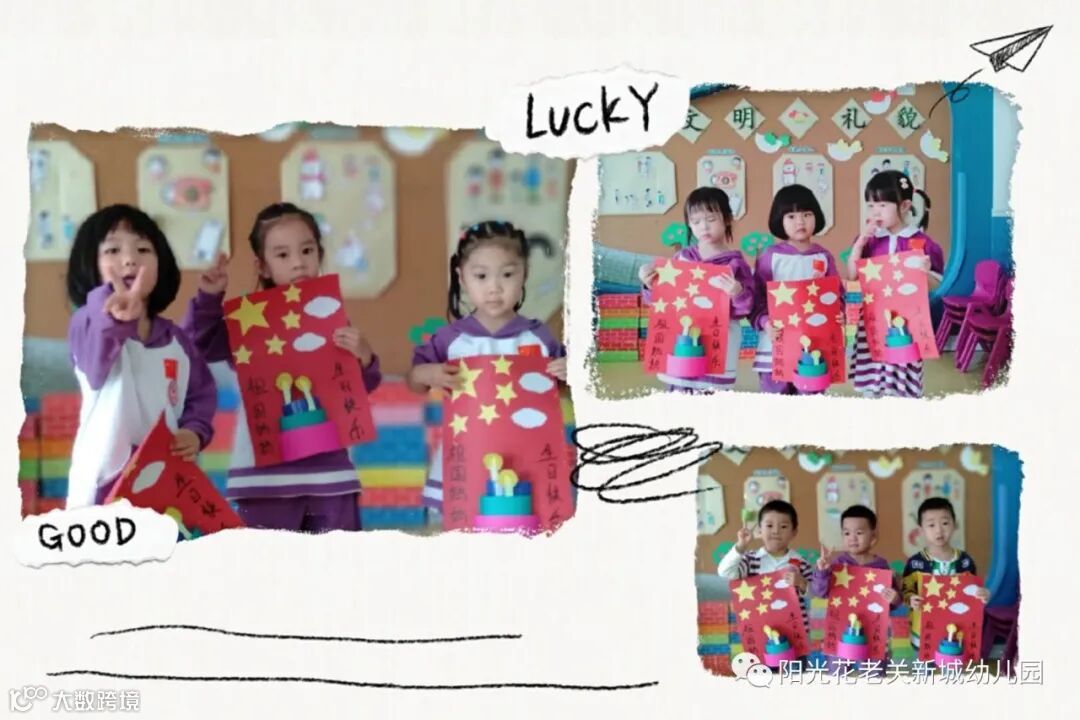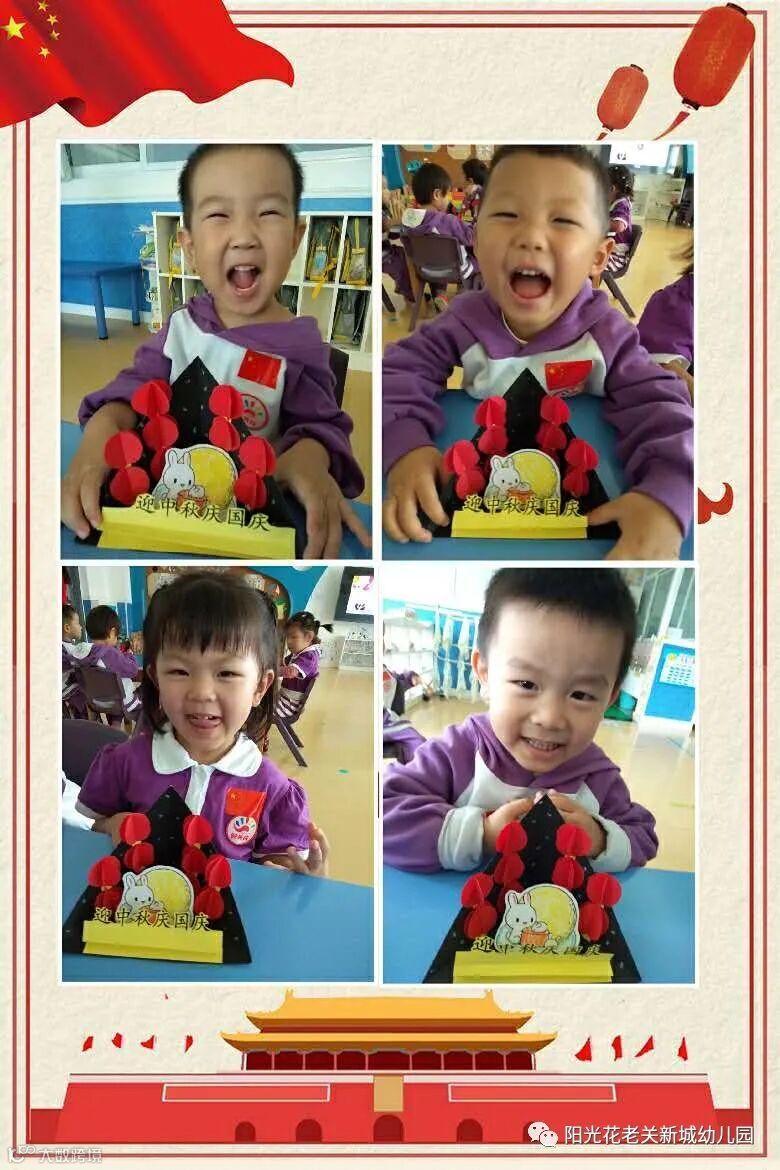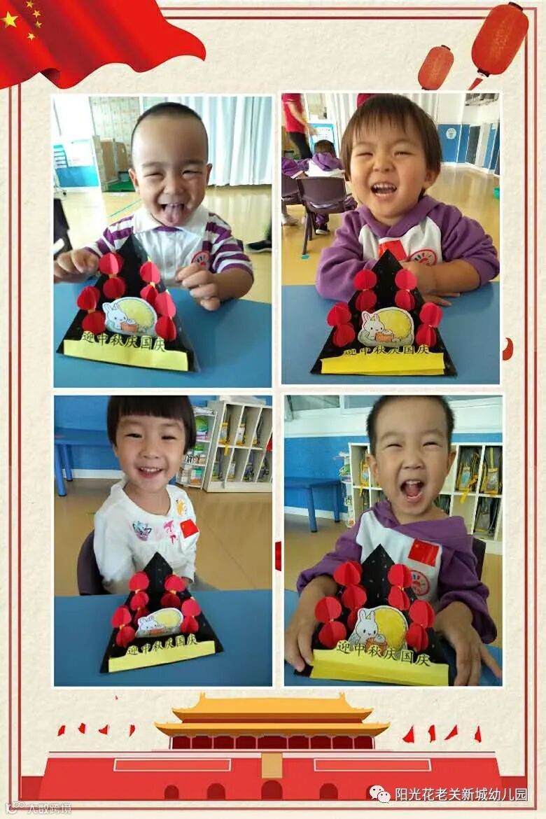 一颗红星、一面国旗、一串灯笼、一直活泼可爱的玉兔······这些都是孩子对祖国妈妈深深的祝福,老师们巧妙地将国庆、中秋的元素融合在一起,和孩子们一起制作出一幅幅创意无限的手工作品,用自己独特的方式表达了热爱祖国的心声,把最美好的祝福送给了祖国妈妈。
