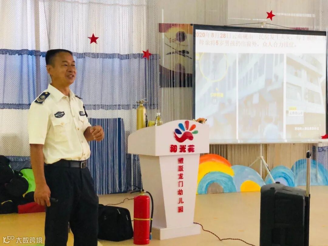 消防救援大队宣讲员肖教官莅临阳光花鲤跃龙门幼儿园,为大家讲解消防安全知识。