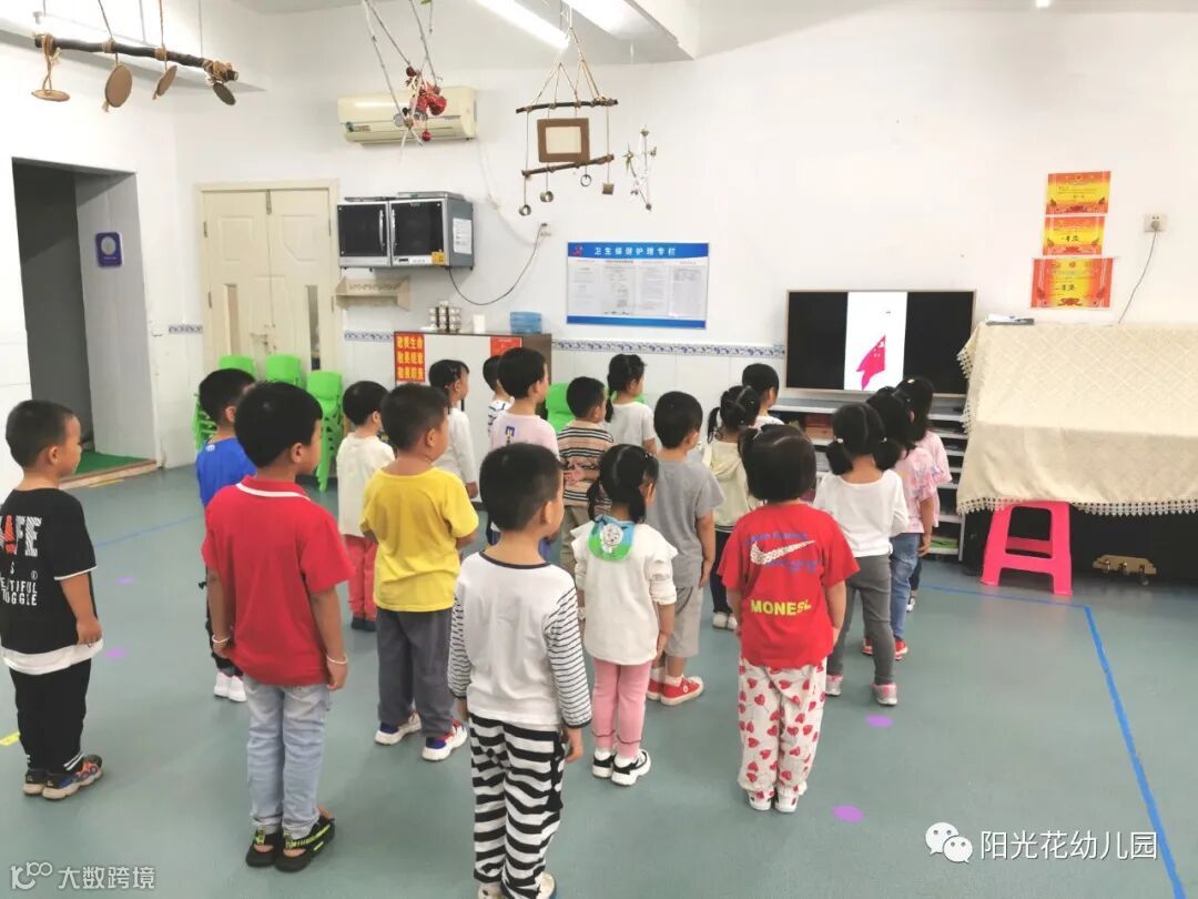 听着庄严的国歌,宝贝们面向国旗,行注目礼。