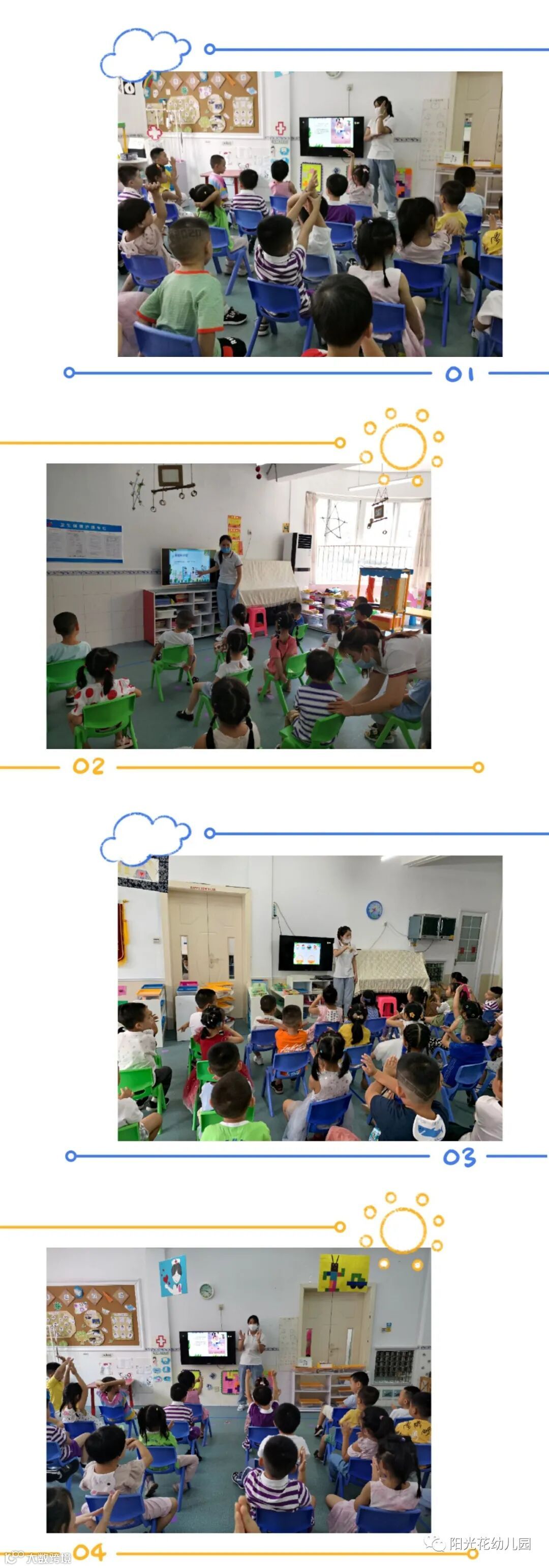 开学第一课,幼儿园将科学防疫作为主题,教师组织宝贝们一起学习如何正确佩戴口罩、七步洗手法、正确的防疫知识,并用绘画、儿歌的形式一一展现,不仅提高了宝贝们的防范意识,还能让宝贝们养成良好的卫生习惯。