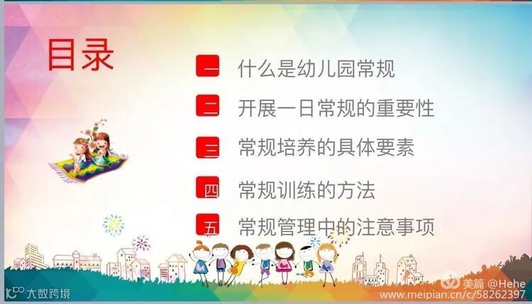 从五个方面展开,让老师们更加清晰,透彻的了解到一日常规对于幼儿、教师都有要求,要做到需要我们多多练习实践。