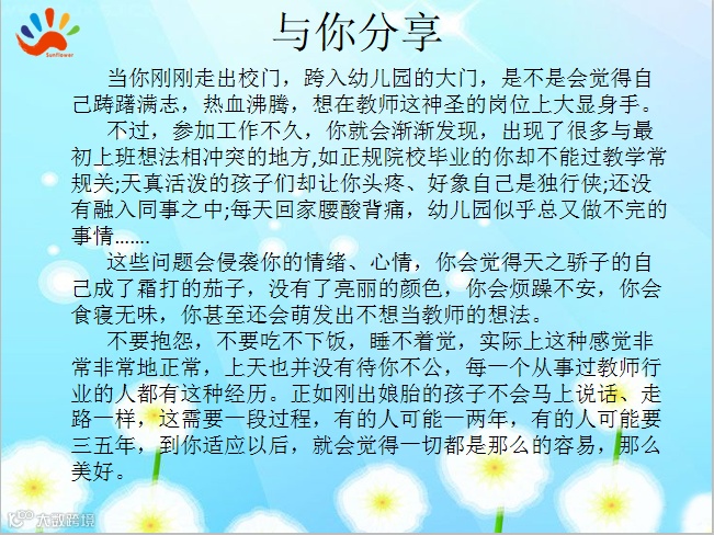 面对新环境,新的工作节奏,难免会有些压力,如何进行自我解压?刘璐园长分享了她的解压妙招:学会适应,做一个有准备的老师,还可以建立朋友圈,找到倾诉对象同时,也要适当放松,不要丢失自己的爱好。