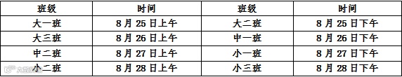 由于幼儿人数多,因此幼儿园从8月25日至8月28日将错峰、错时安排家长将幼儿入园所需的衣物被褥等用品标注上班级、姓名并送至幼儿园门口指定地点,届时将由班主任与保育员一同接收。请家长们务必要看清自己班级的时间段噢。