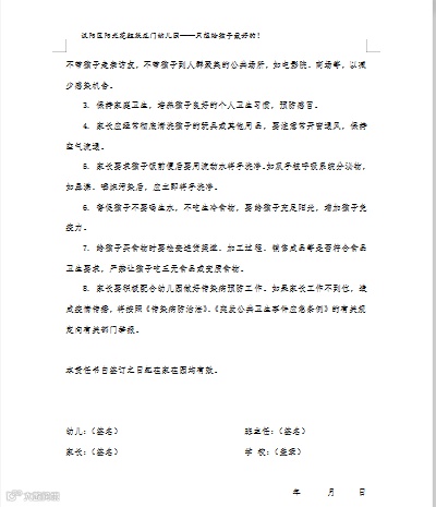 入园幼儿家长须仔细阅读责任书内容并签字完成《传染病防控安全责任书》,来园时签订将表格上交班主任。