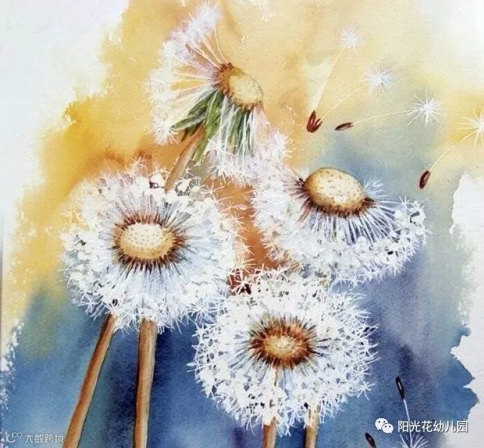 蒲公英有一个圆圆的花骨朵,但是风一吹,会随风飘散,真的好美好美,如棉似雪,孩子们很喜欢,我们决定用手指点画的形式来呈现这幅美丽的作品,在制作的过程中充分发挥孩子们的想象力、创造力!