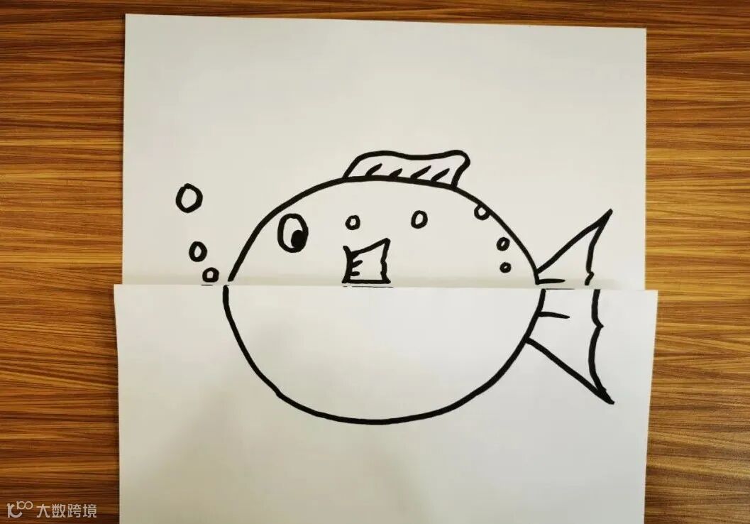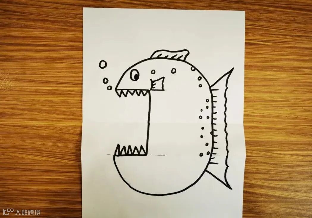 步骤三:将纸打开,把“大鱼”的身体补充完整,画上“牙齿”。