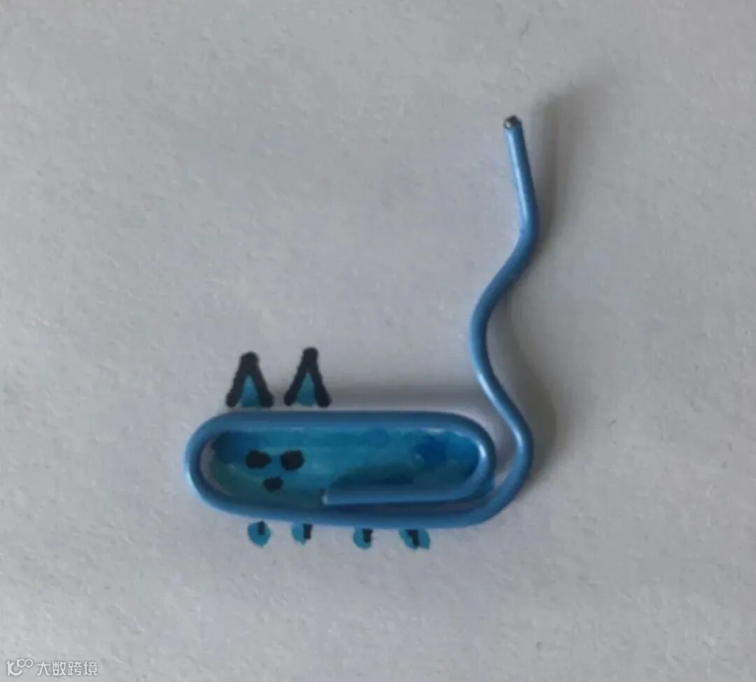 步骤一:把回形针的一头往上拉成波浪形,作“小猫”的“尾巴”,摆在白纸上。