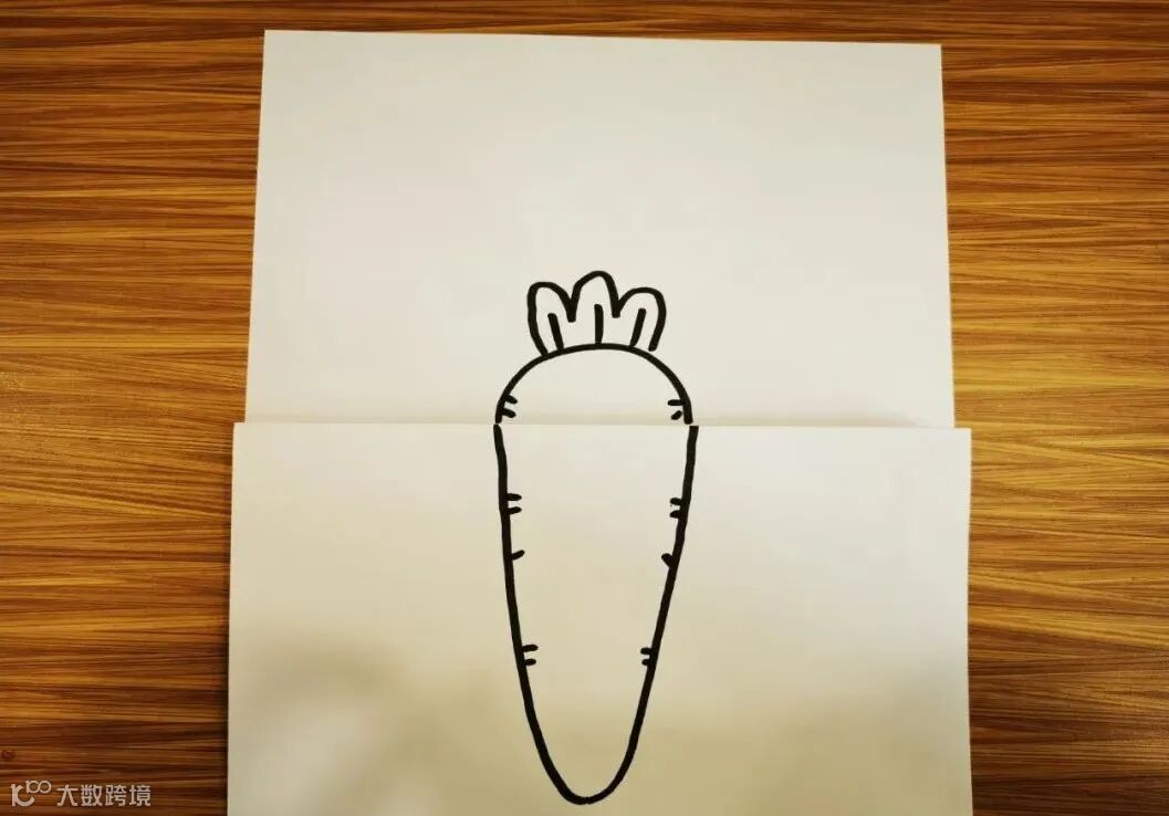 步骤三:把纸打开,把“胡萝卜”的上、下部分分别画完整,并在“胡萝卜”中间空白部分画上“小兔子”。