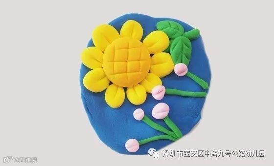 4、用蓝色的粘土做出背景后,用绿色粘土给向日葵做出花茎与叶子。