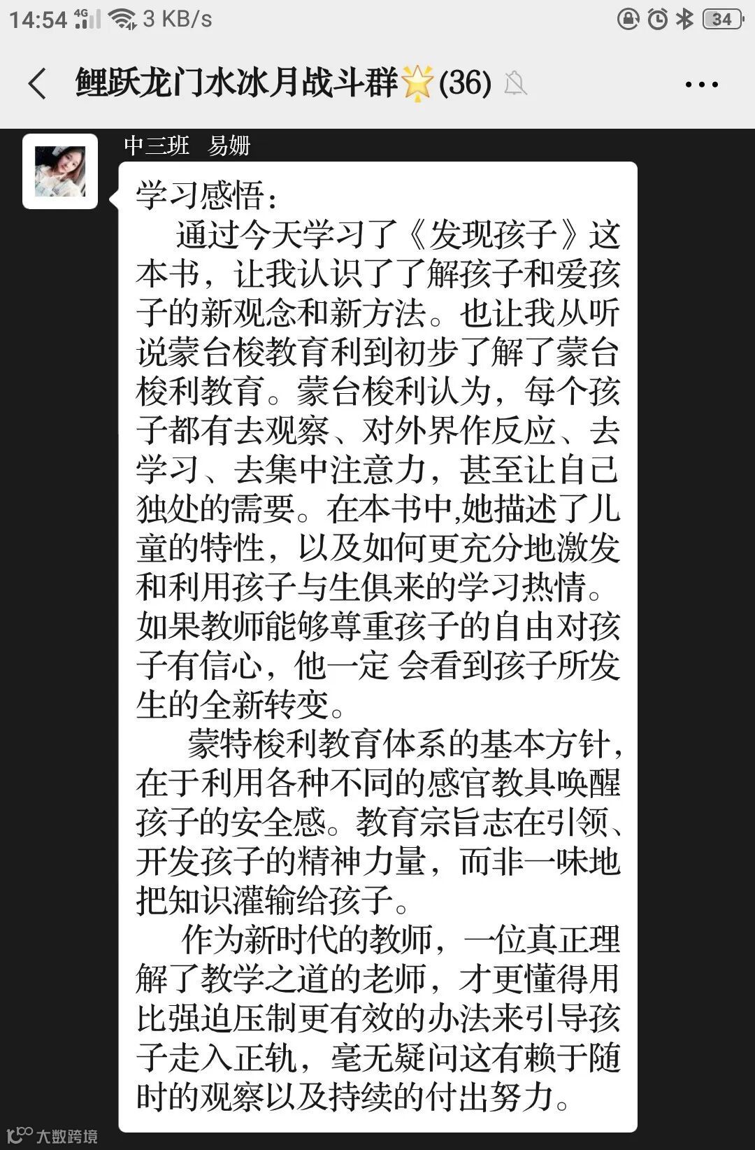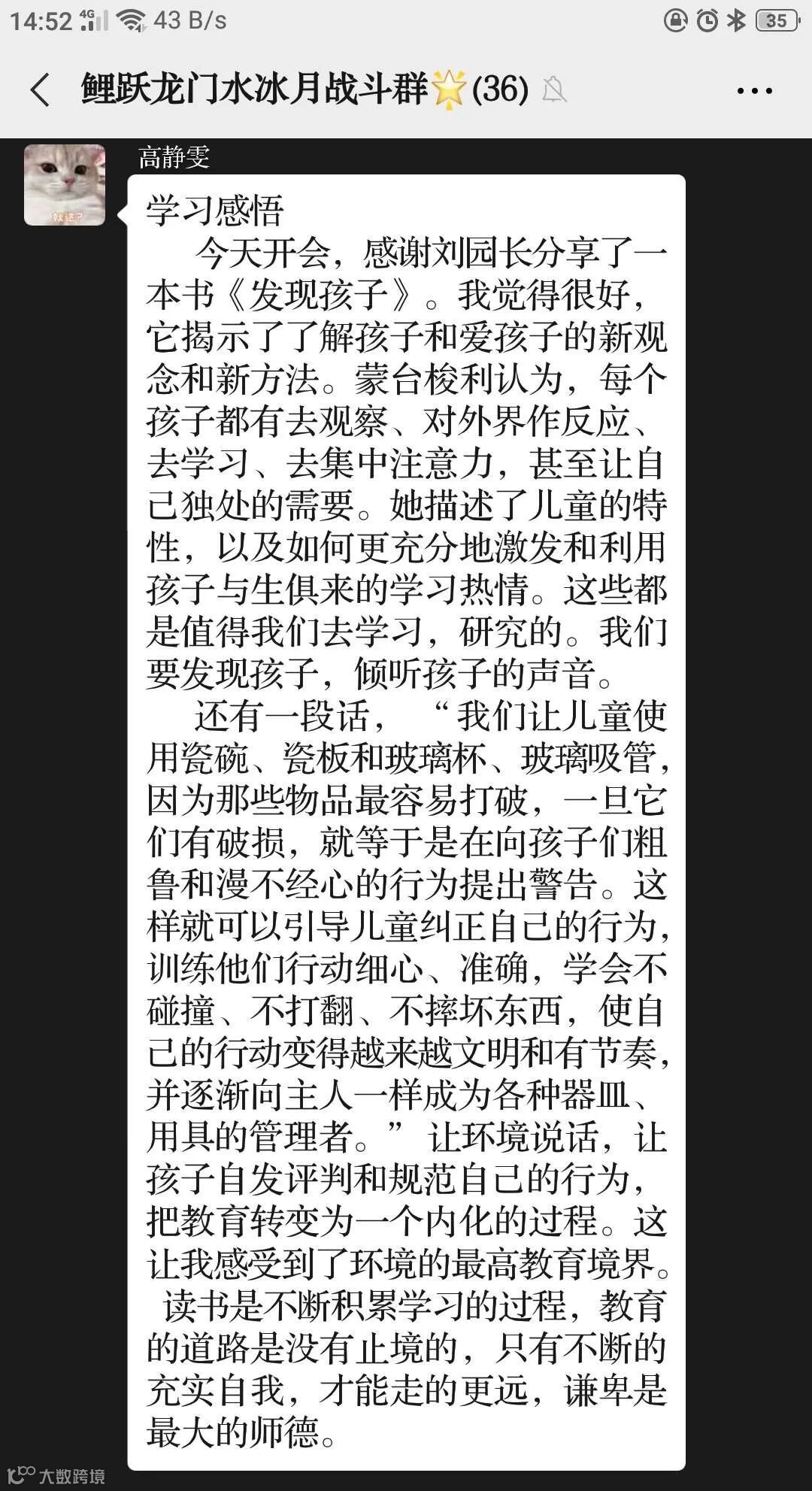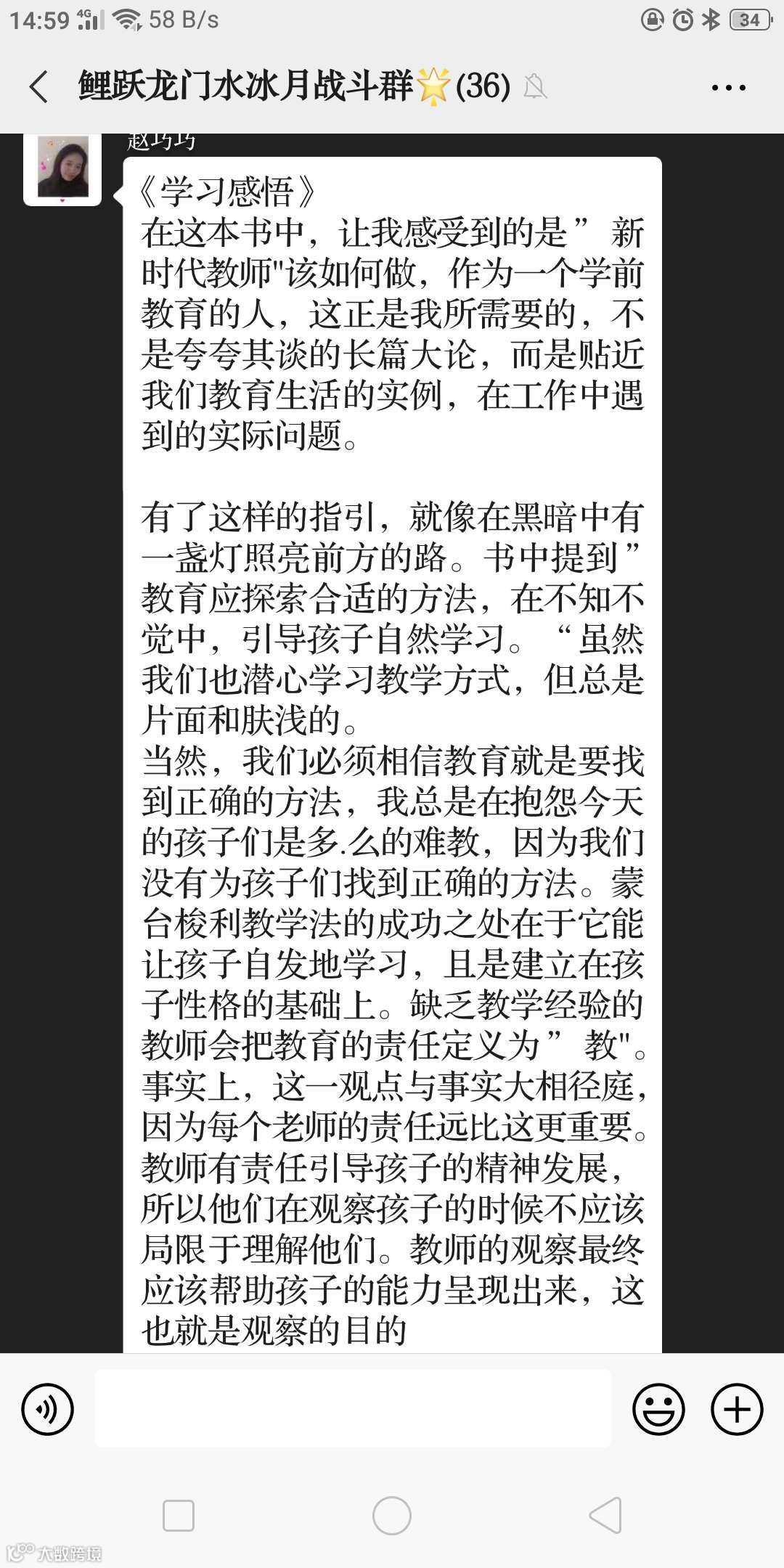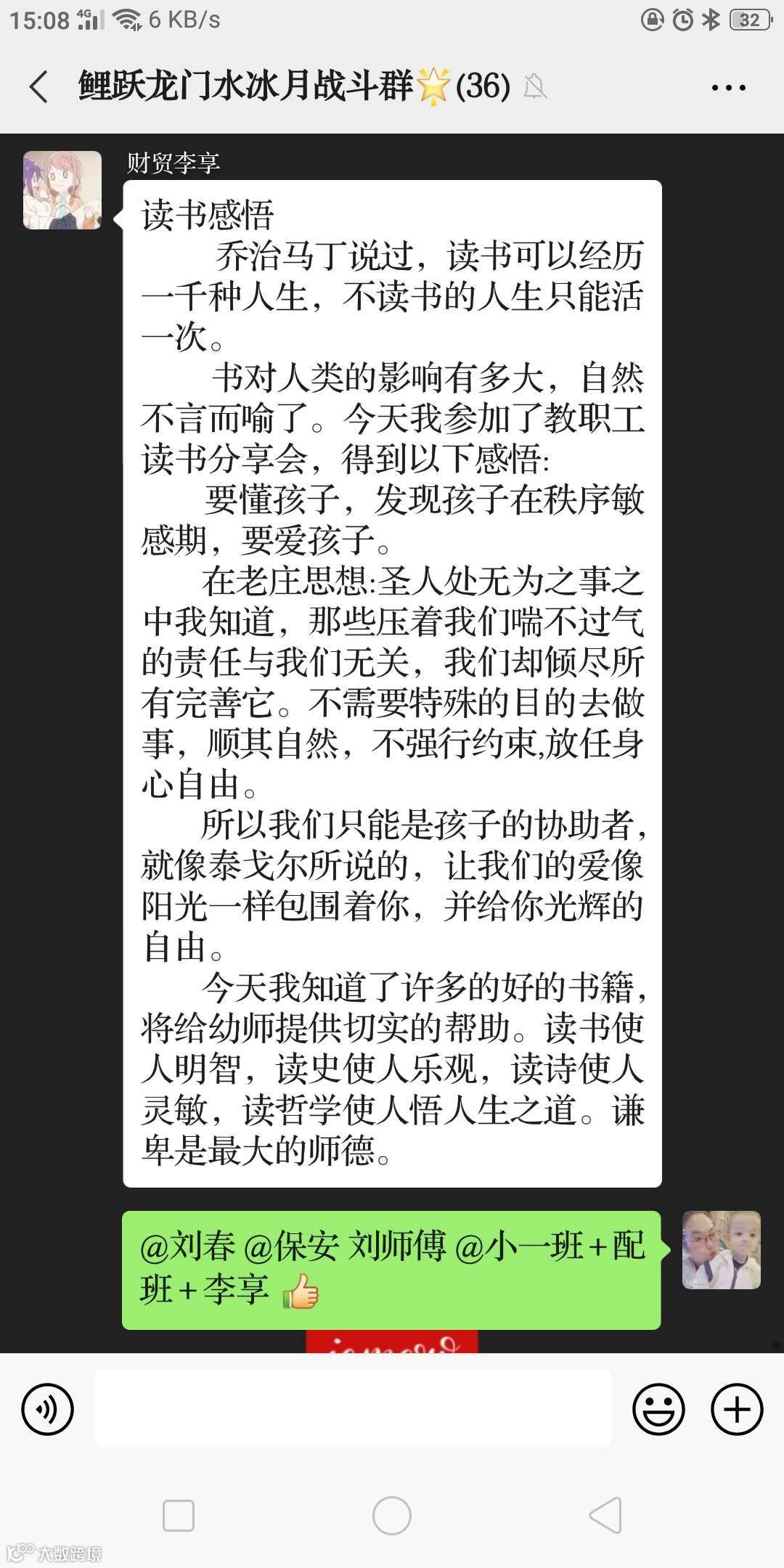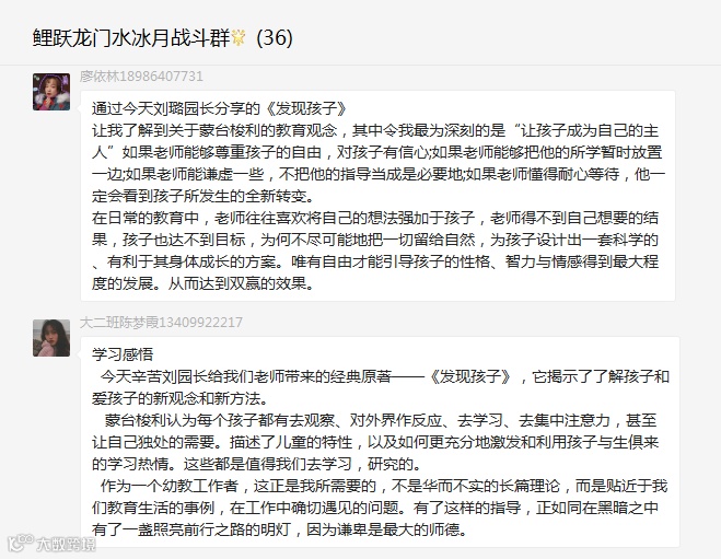 读书分享会后,老师们在群内行了交流,在与同伴的互动分享中感受到了心灵的洗礼与思想的交融。