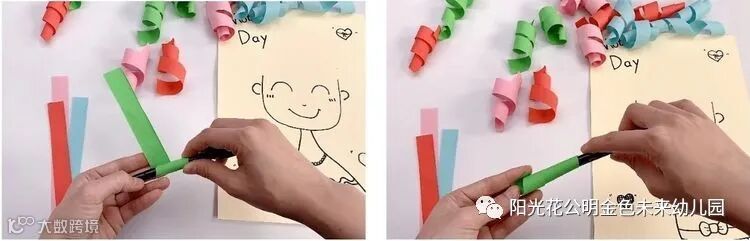 2.用笔把剪裁好的各色手工纸条卷成头发的形状。