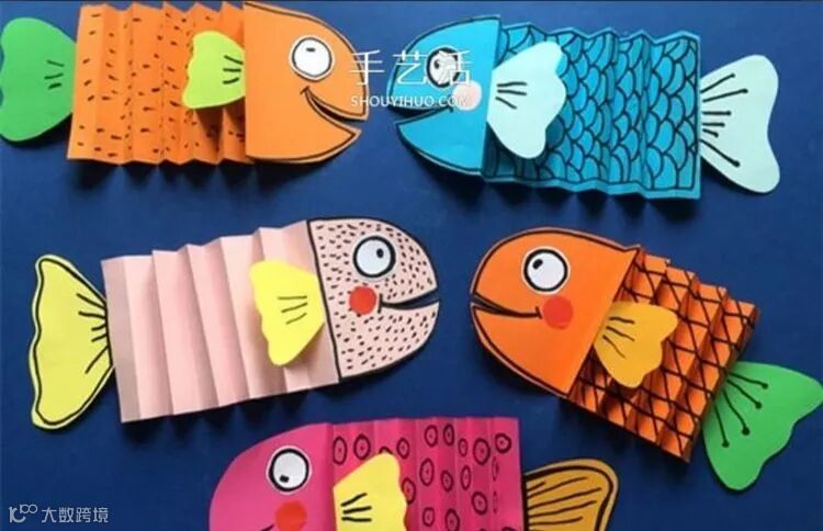 3.另外取彩纸剪出小鱼的鱼鳍和尾巴,再用白纸做小鱼眼睛。