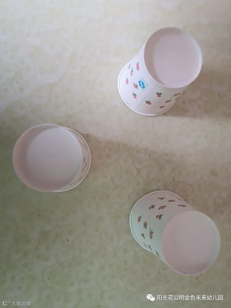 2. 将3个一次性纸杯倒扣在桌面上,摆成一个三角形。