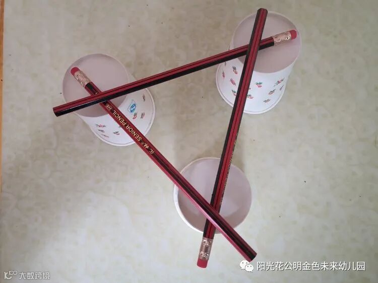 3. 将3支铅笔的一端分别放在3个一次性纸杯上,另一端在中间相交搭成一个三角形。