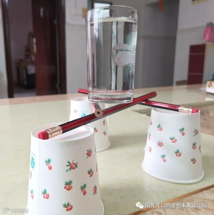 4. 将装满水的玻璃杯轻轻地放在铅笔中间的三角形上。看,铅笔将玻璃杯稳稳地托起来啦。