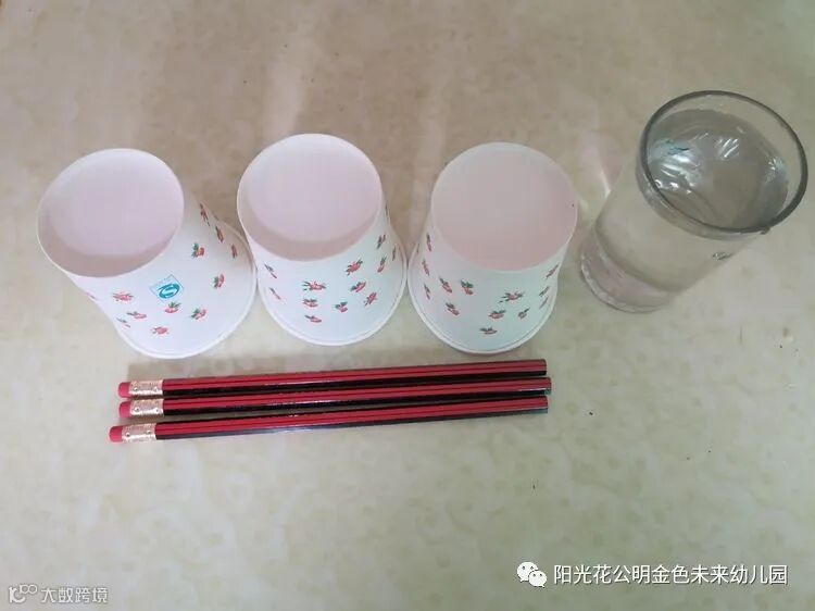 1.铅笔3支、一次性纸杯3个、装满水的玻璃杯1个。