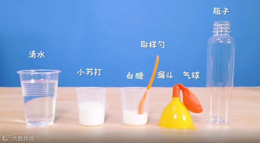 小苏打、清水、白醋、取样勺、漏斗、气球、瓶子