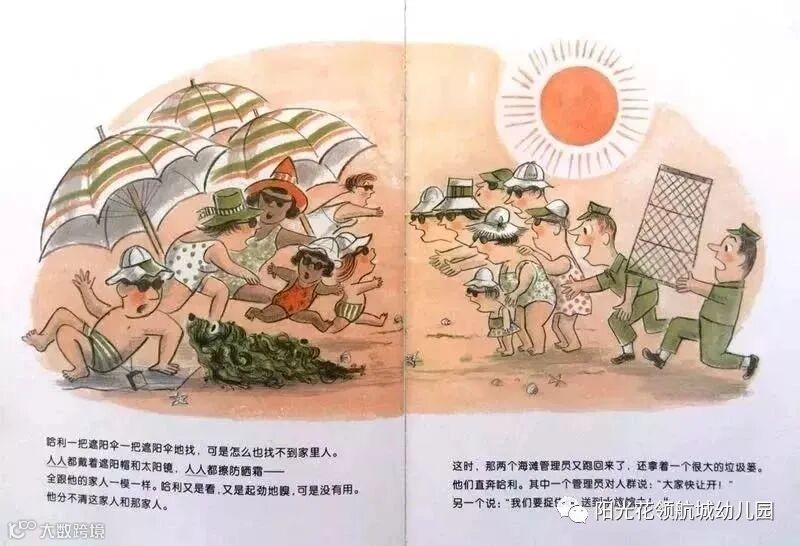 哈利一把遮阳伞一把遮阳伞地找,可是怎么也找不到家里人。人人都戴着遮阳帽和太阳镜,人人都擦防晒霜——