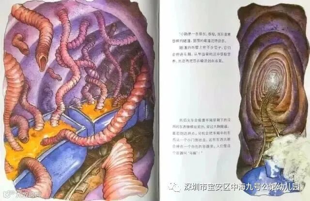 “小肠是一条很长很窄,而且非常昏暗的隧道,里面的弯道还特别多。隧道的四壁上有不少管子,他们会伸进车厢,从里面装的泥中吸取营养,然后再把营养输送到血液里。然后火车会载着车厢里剩下的没用的东西继续往前开,穿过大肠隧道,最后到达终点。司机会把车厢中的东西从一个小门倒出去,这些东西大都会掉在一个白色的容器里。人们管这个容器叫做‘马桶’!”