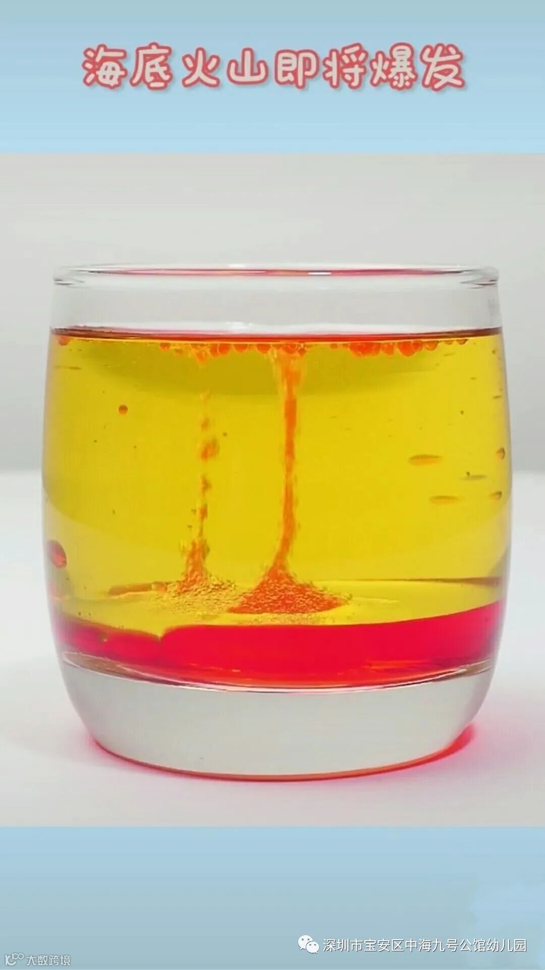 泡腾片含有机酸和小苏打,与水反应产生二氧化碳把含色素的水带到油中,与油不相溶又沉下来,产生类似熔岩喷发的效果。