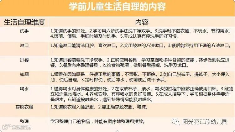 学前儿童生活自理能力主要指日常生活自理能力,包括自我意识形成和日常生活自理能力的全面提高,即掌握生活自理的技能,提高动手能力;感受自己的成长,树立自立意识;养成自己做事的好习惯,积累自理生活的经验。