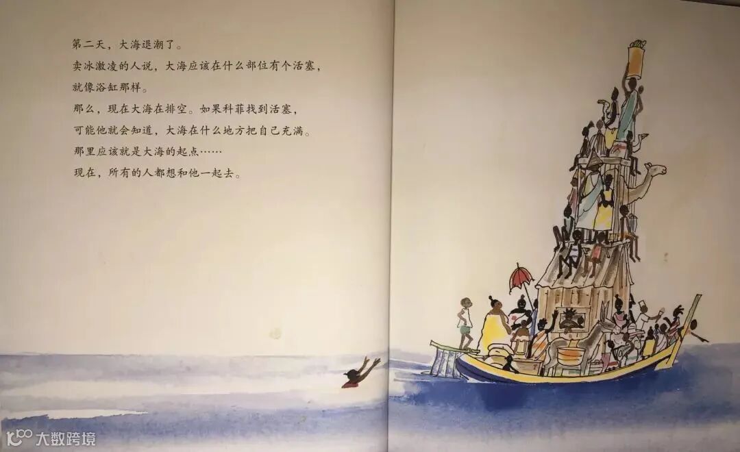 第二天,大海退潮了。卖冰激淋的人说,大海应该在什么部位有个活塞,就像浴缸那样。那么,现在大海在排空。如果科菲找到活塞,可能他就会知道,大海在什么地方把自己充满。那里应该就是大海的起点……现在,所有的人都想和他一起去。