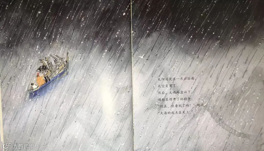 太阳消失在一片云后面,天空变黑了,然后,大雨倾盆而下,造船匠撑开了他的伞,“现在,你看到了吗?”他问。“大海的起点在天上。”