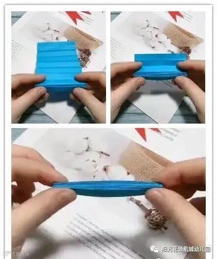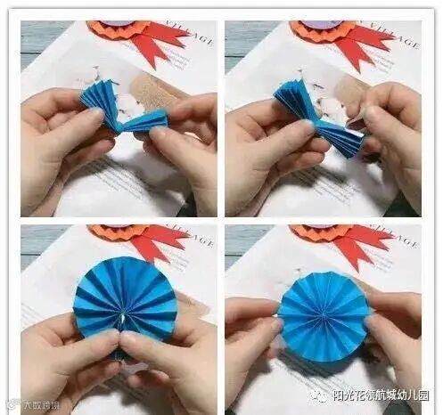3.对折成一把“小扇子”,用双面胶固定成圆形的“小扇子”。