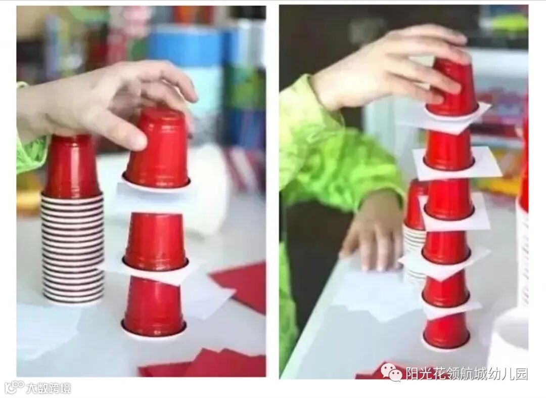 两两纸杯中间放一张纸片,快速抽出纸片,让上面的纸杯直接套在下面的纸杯上,操作中要保持不倒,幼儿与家长轮流抽纸片。