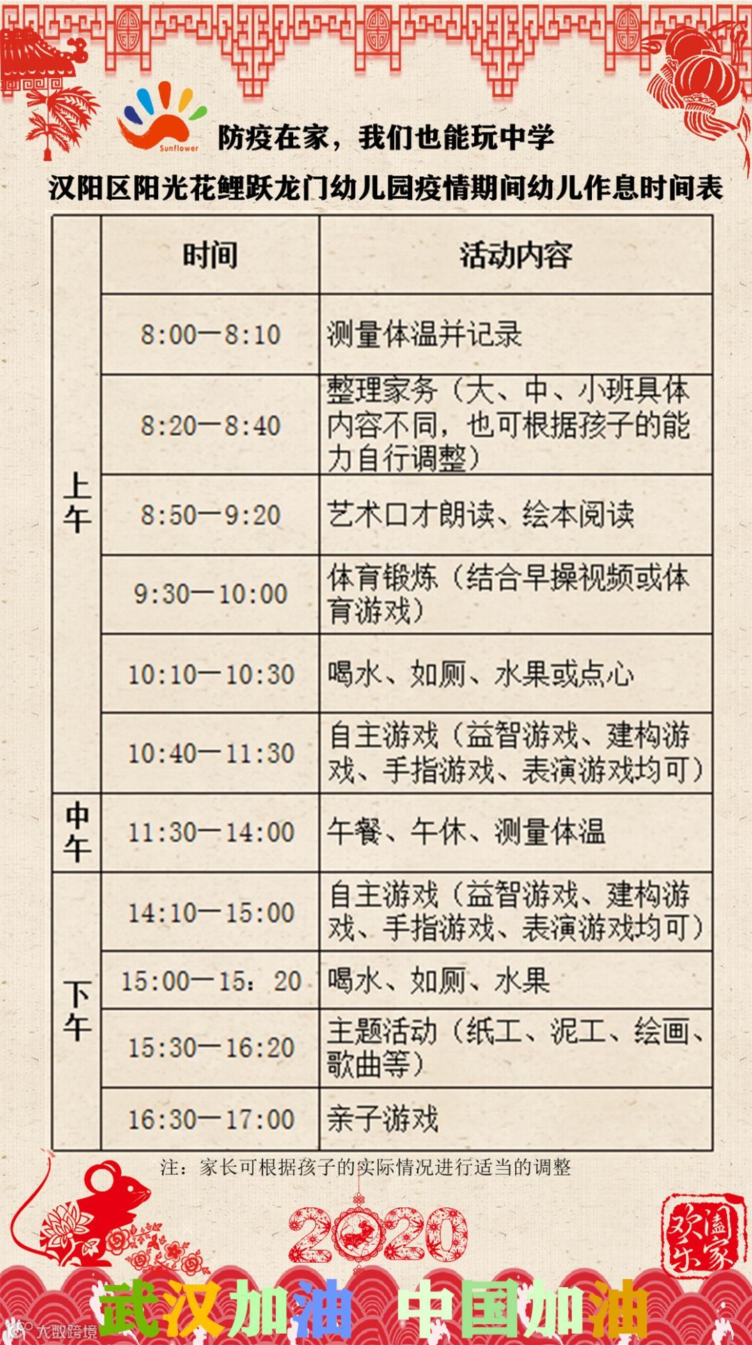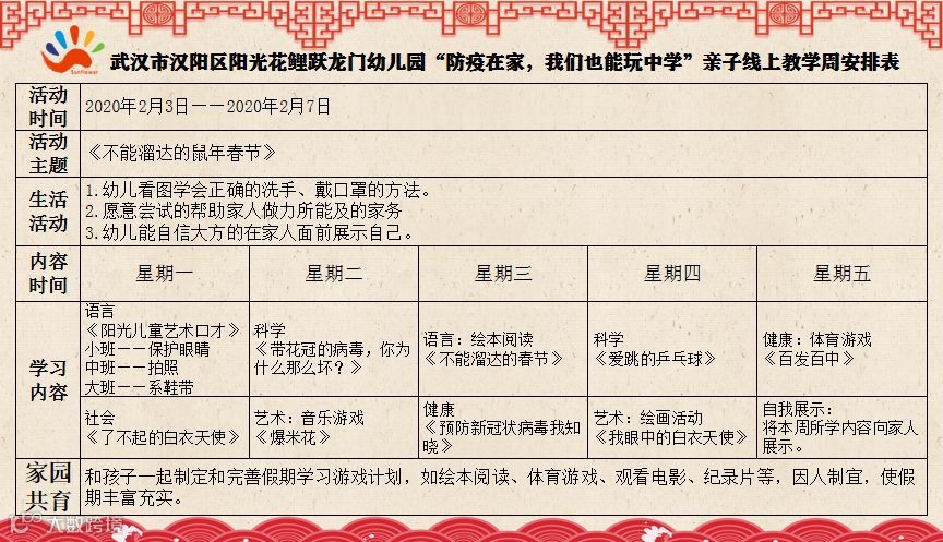 为让幼儿在家也能养成良好的生活和学习习惯,针对园所幼儿的实际情况,特制定疫情期间幼儿在家作息时间表和线上教学周安排表如下: