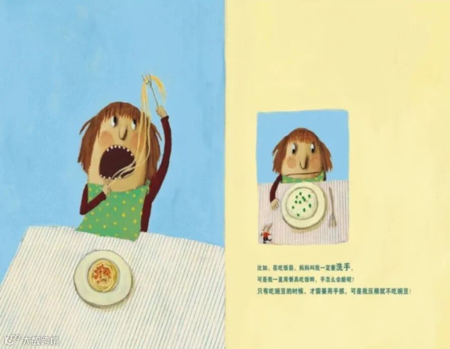 比如,在吃饭前,妈妈叫我一定要洗手,可是我一直用餐具吃饭啊,手怎么会脏呢?只有吃豌豆的时候,才需要用手抓,可是我压根就不吃豌豆!