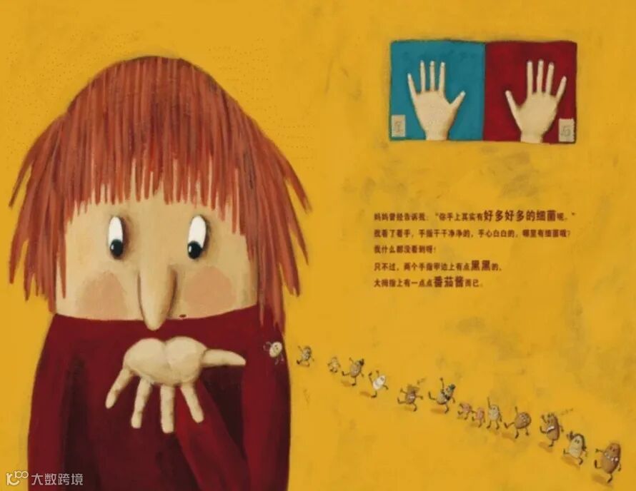 妈妈曾经告诉我:“你手上其实有好多好多的细菌呢。”我看了看手,手指干干净净的,手心白白的,那里有细菌哦?我什么都没看到呀,只不过,两个手指甲边上有点黑黑的,大拇指上有一点点番茄酱而已。