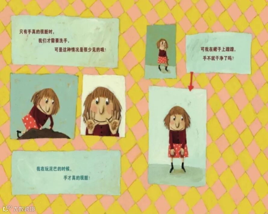 只有手真的很脏时,我们才需要洗手,可是这种情况是很少见的哦。我在玩泥巴的时候,手才真正的很脏,可我在裙子上蹭蹭,手不就干净了吗?