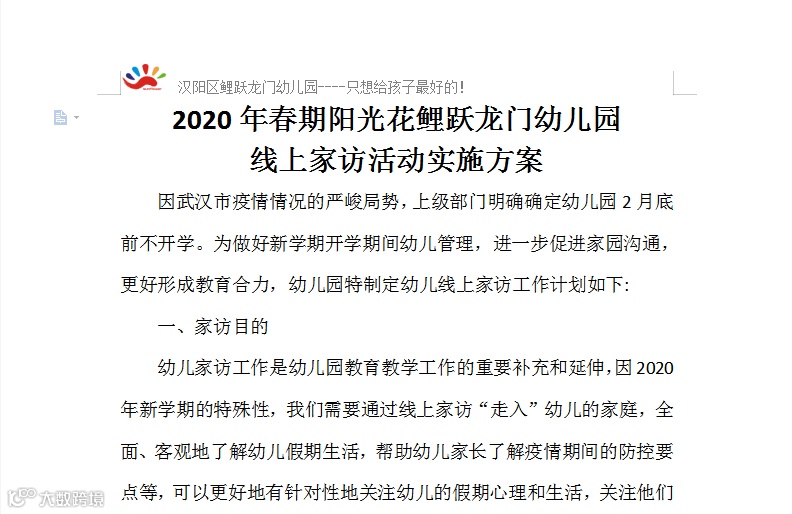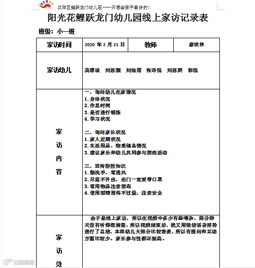 为使线上家访做到有序、有效,家访活动开始之前,幼儿园下发了“线上家访通知”,园长带领老师们开展网络会议,就家访内容包括疫情防控、习惯养成、心理辅导、假期活动建议等展开研讨。制订了详细的《阳光花鲤跃龙门幼儿园线上家访活动实施方案》和《线上家访记录表》,对线上家访的方式、内容、要求等做了细致的要求。