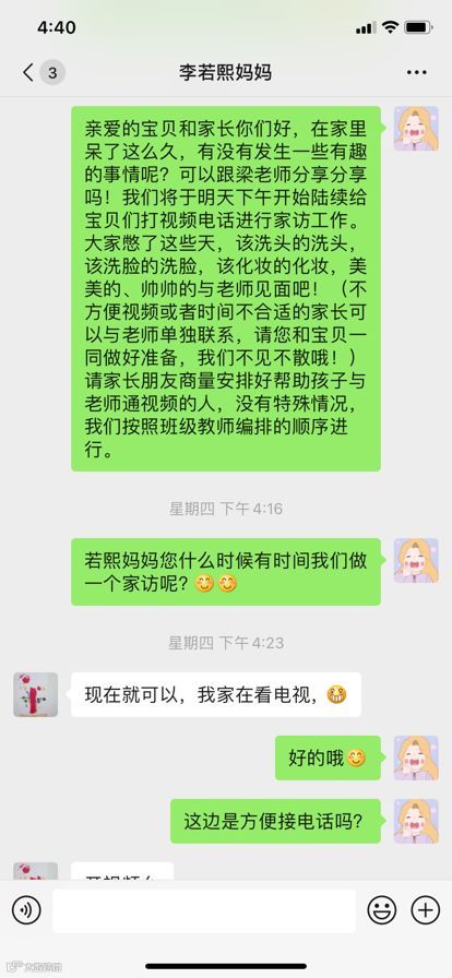本次线上家访,教师通过微信、电话等多种形式对幼儿进行了线上家访 。在视频家访中,孩子们兴奋地向老师讲述了自己寒假里发生的趣事,“老师你看这是我画的画”“妈妈老师,我学会了洗袜子”“老师,我在锻炼身体”“我想老师和小伙伴了”……话语中透露出了彼此的亲昵与想念。老师们还及时提醒幼儿做好自己的假期规划,保持良好的作息习惯,多锻炼身体,帮助父母做力所能及的家务劳动,以健康的心态和体魄抗击疫情。