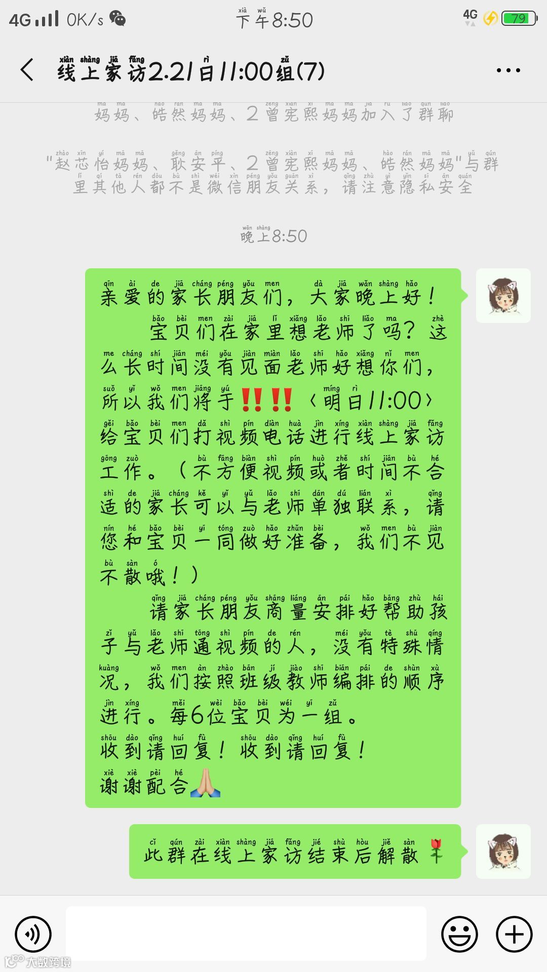 通过线上家访,老师了解了孩子和家长们的身体状况及实时位置,并规劝有串门或外出计划的家庭在家休息。面对老师的热切关怀和问候,家长们为了解决老师的担心,纷纷保证会听从指挥,做好防护,不外出,常通风,勤洗手。同时,老师也会引导家长采用正确的方法抵御传染病,保护自己和家人的健康,家访率达100%,将有效防御疫情的方法传到每个家庭,让幼儿和家长做好新型冠状病毒的防护工作,以健康的心态和体魄抗击疫情。